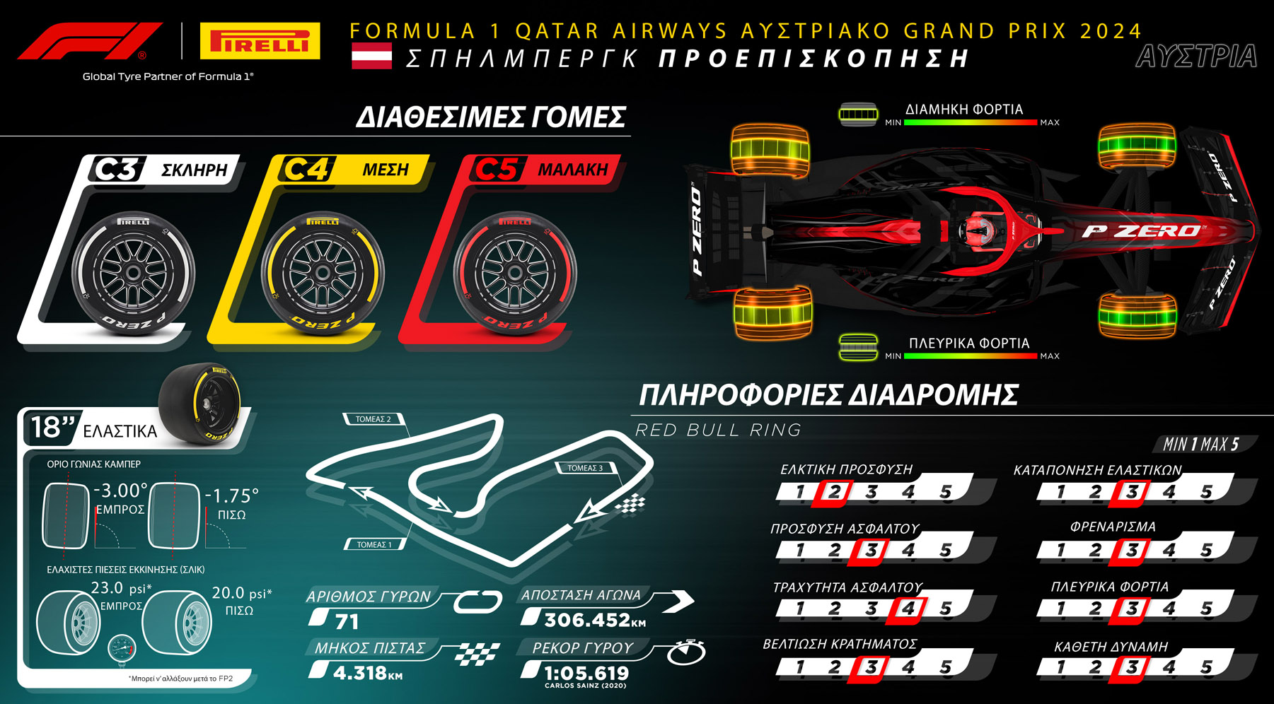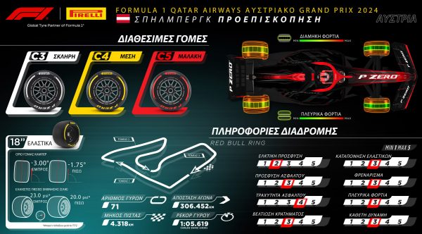 Όπως συνηθίζεται για αυτόν τον αγώνα, η Pirelli έχει επιλέξει τις τρεις πιο μαλακές γόμες της γκάμας του 2024, συγκεκριμένα τη C3 ως σκληρή, τη C4 ως μέση και τη C5 ως μαλακή. Η επιφάνεια οδοστρώματος του Σπίλμπεργκ είναι αρκετά παλιά και επομένως πολύ τραχιά. Οι πλευρικές δυνάμεις που ασκούνται στα ελαστικά είναι σαφώς χαμηλότερες από τον μέσο όρο της σεζόν, με αποτέλεσμα πολύ περιορισμένη φθορά συνολικά.