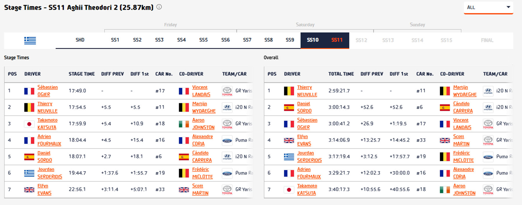Παράλληλα, ο Sebastien Ogier της Toyota κέρδισε την ειδική διαδρομή των Αγίων Θεοδώρων και μείωσε τη διαφορά του από τον Neuville κατά 5,7 δευτερόλεπτα. Ωστόσο, ο Γάλλος οδηγός θεωρεί πως το χάσμα των 1 λεπτού και 21,5 δευτερολέπτων από τον πρωτοπόρο είναι δύσκολο να καλυφθεί, ιδιαίτερα με δεδομένες τις προκλήσεις που αντιμετωπίζουν τα πληρώματα στην Ελλάδα, όπου η έλλειψη σέρβις κατά τη διάρκεια της ημέρας κάνει τον αγώνα ακόμα πιο δύσκολο.