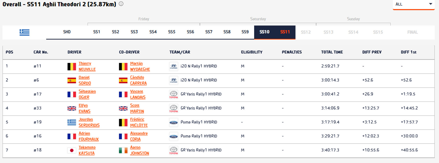 Ο πρωτοπόρος Neuville συνέχισε χωρίς απρόοπτα στο δεύτερο πέρασμα από τους Άγιους Θεοδώρους, οδηγώντας με σταθερή στρατηγική και αποφεύγοντας τα ρίσκα. Κατέγραψε έναν πολύ ανταγωνιστικό χρόνο, μόλις 5,5 δευτερόλεπτα πιο αργός από τον Ogier, αλλά ταχύτερος από τον Sordo, ο οποίος συνεχίζει με προβλήματα στο λαβωμένο Hyundai i20 του.