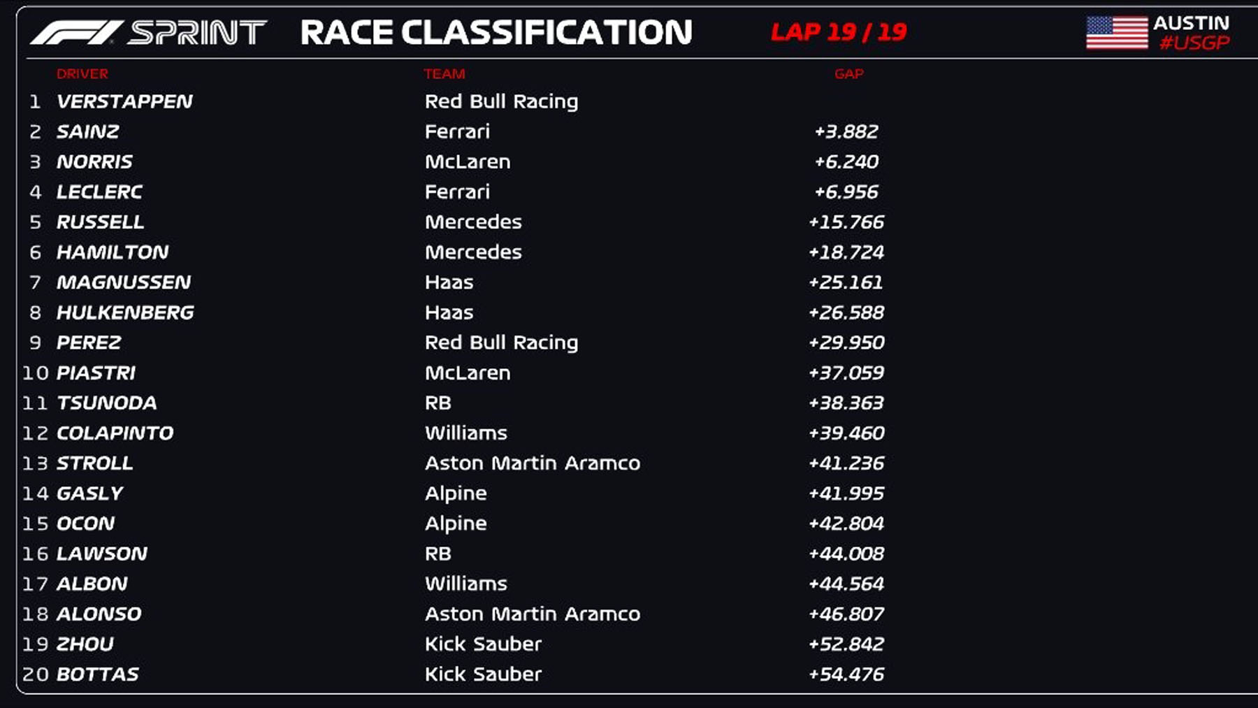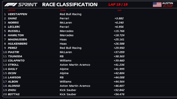 Ο Max Verstappen κατέκτησε τη νίκη στο sprint του Grand Prix των ΗΠΑ, ενισχύοντας την πρωτοπορία του στο πρωτάθλημα, ενώ ο Carlos Sainz εκμεταλλεύτηκε λάθος του Lando Norris στον τελευταίο γύρο για να εξασφαλίσει τη δεύτερη θέση. Στις 01:00 θα μάθουμε την γραμμή εκκίνησης του αυριανού αγώνα που θα ξεκινήσει στις 22:00.