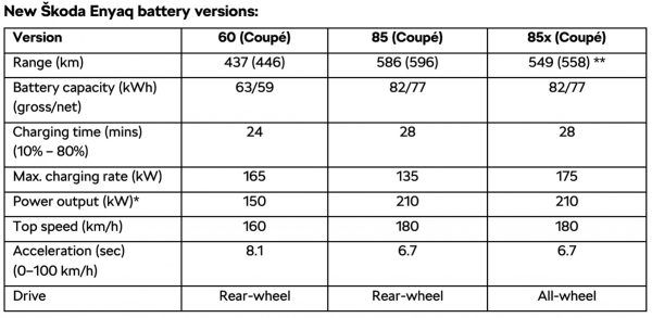 Η τετρακίνητη έκδοση Enyaq 85x προσφέρει επιπλέον πρόσφυση και αυτονομία έως 559 χιλιόμετρα. Η μέγιστη ταχύτητα κυμαίνεται από 160 έως 180 χλμ./ώρα, ενώ η φόρτιση από 10% έως 80% μπορεί να ολοκληρωθεί σε μόλις 28 λεπτά χάρη στη μέγιστη ισχύ φόρτισης των 175 kW.