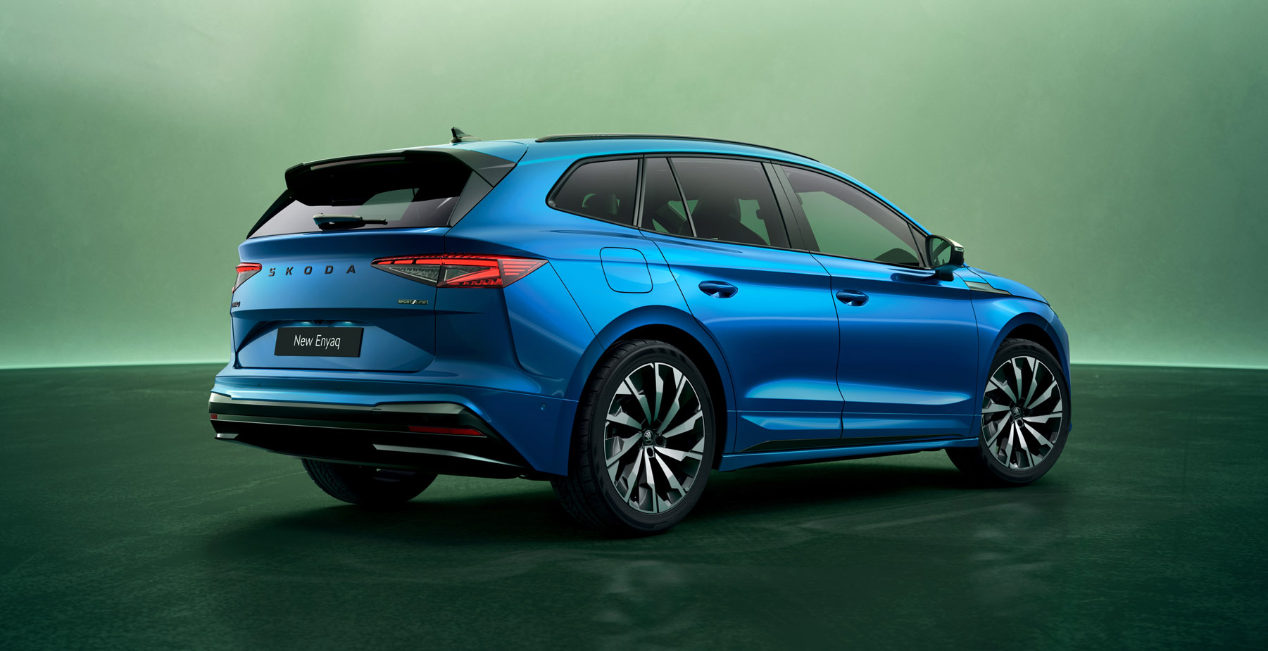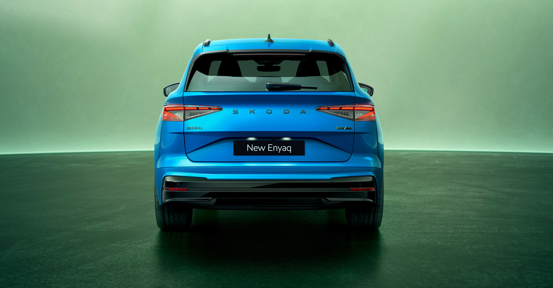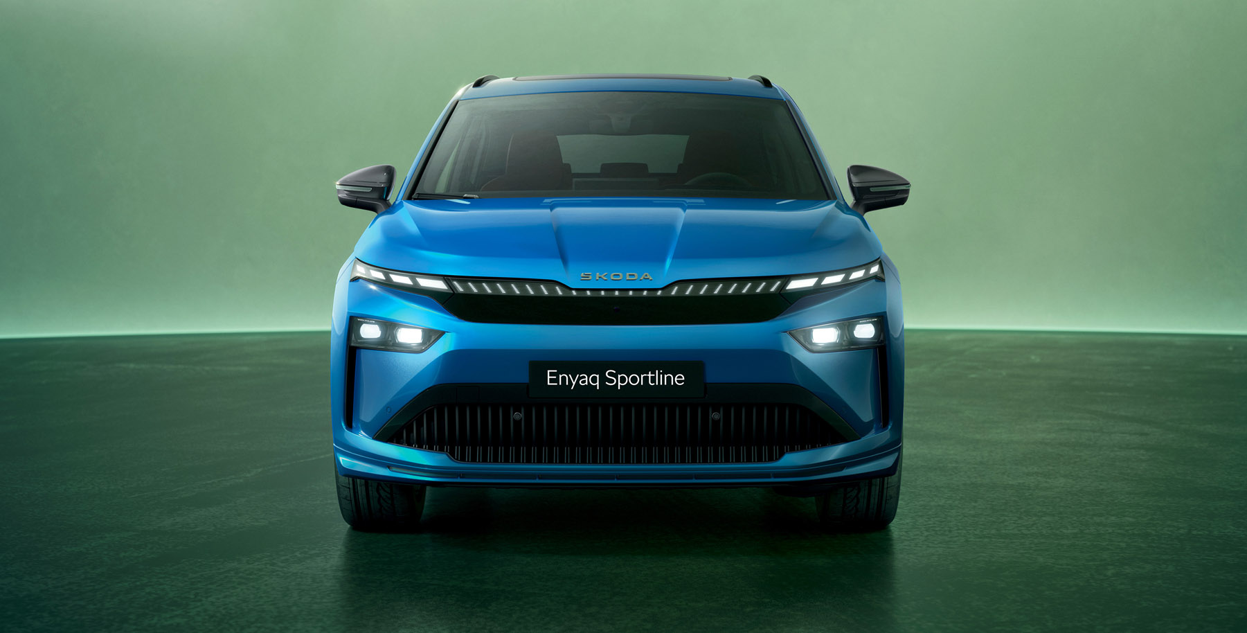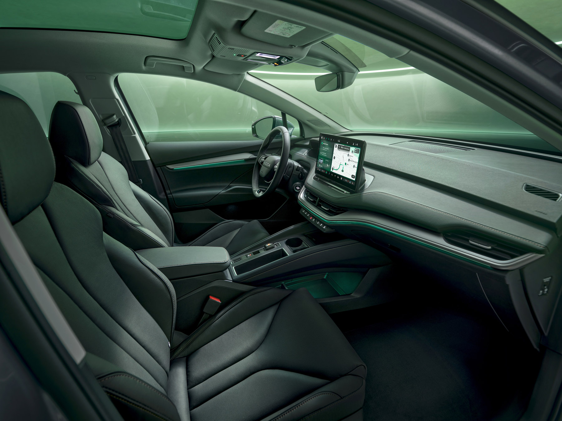 Οι προβολείς LED Matrix χωρίζονται σε δύο τμήματα και ενώνονται με ένα φωτεινό τόξο που επεκτείνεται έως τα φτερά. Οι νέες λεπτομέρειες «Unique Dark Chrome» και η αποκλειστική εξωτερική απόχρωση «Olibo-Grün» δίνουν στο Enyaq έναν φρέσκο και πιο μοντέρνο στιλ.