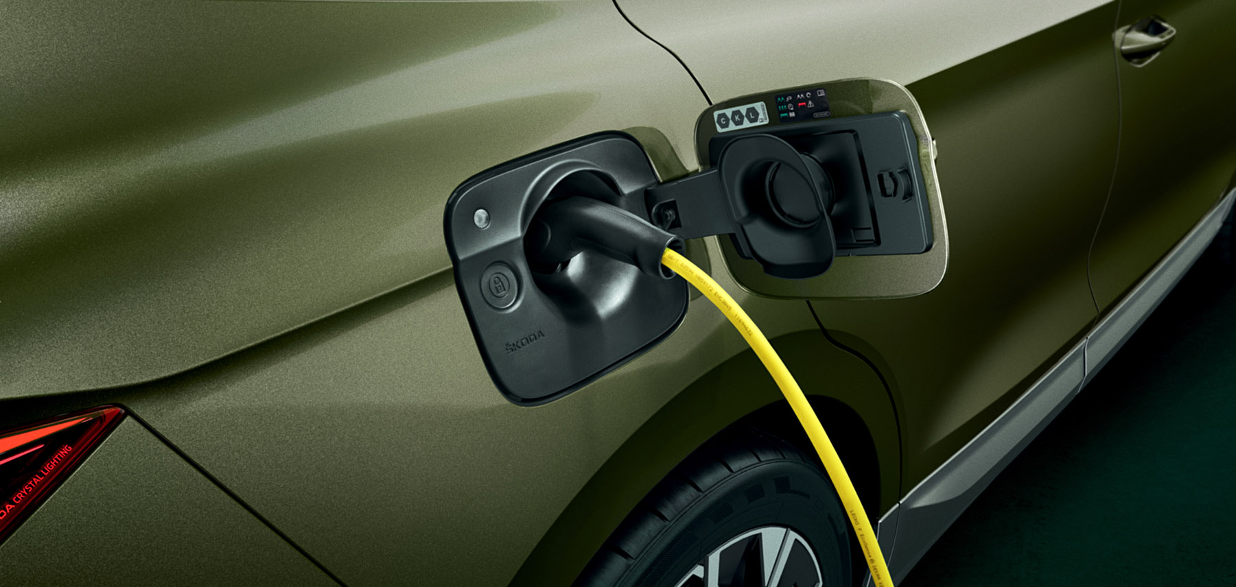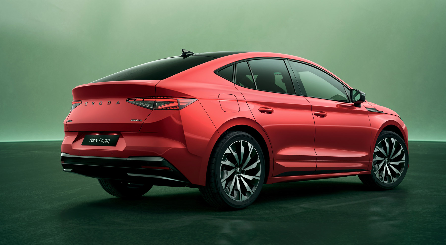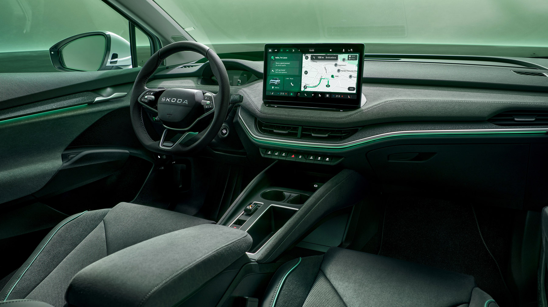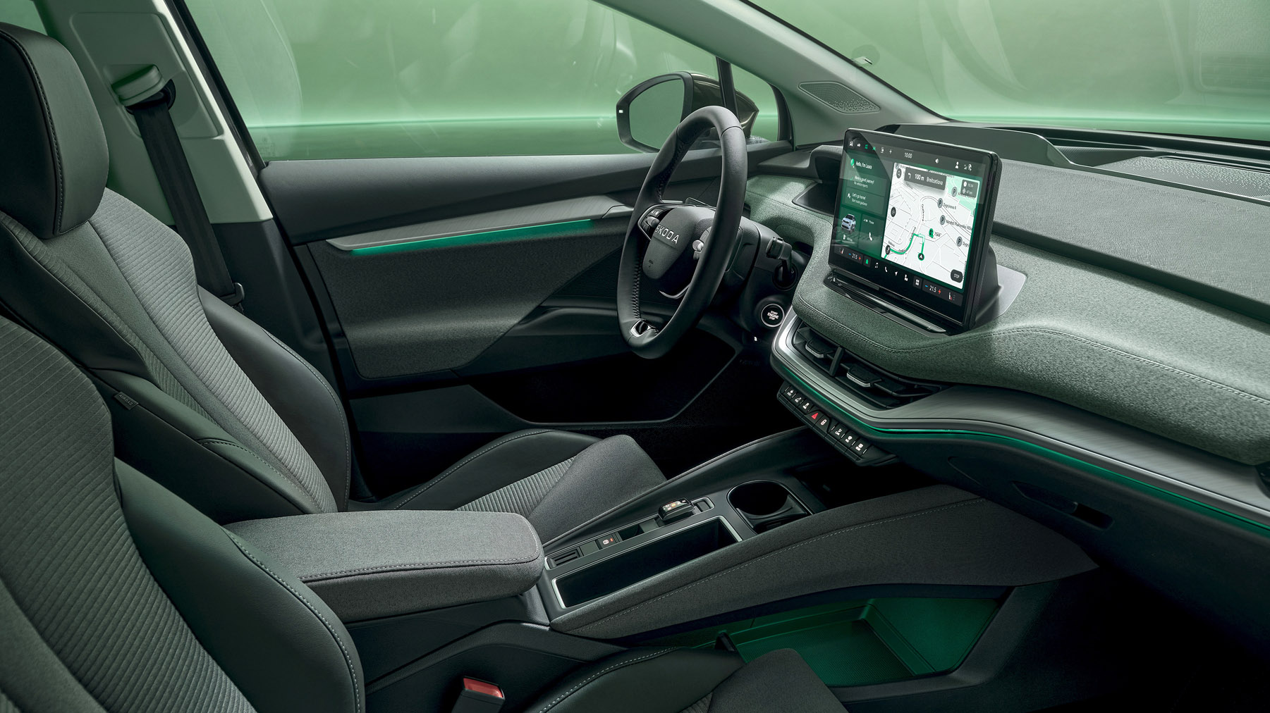 Οι προβολείς LED Matrix χωρίζονται σε δύο τμήματα και ενώνονται με ένα φωτεινό τόξο που επεκτείνεται έως τα φτερά. Οι νέες λεπτομέρειες «Unique Dark Chrome» και η αποκλειστική εξωτερική απόχρωση «Olibo-Grün» δίνουν στο Enyaq έναν φρέσκο και πιο μοντέρνο στιλ.