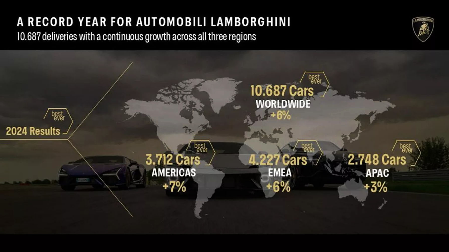 Η Lamborghini κατέγραψε το 2024 την καλύτερη εμπορική της χρονιά, σημειώνοντας νέο ρεκόρ με 10.687 παραδόσεις, μία αύξηση 6% σε σχέση με το προηγούμενο έτος.