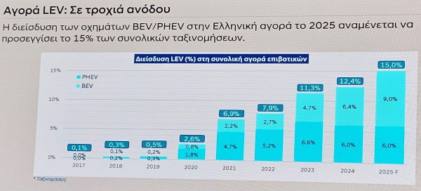Σύμφωνα με τα δεδομένα, η διείσδυση των ηλεκτρικών (BEV) και plug-in hybrid (PHEV) οχημάτων αυξάνεται σταθερά, φτάνοντας το 2023 το 11,3% των συνολικών ταξινομήσεων. Για το 2025, η Hyundai προβλέπει ότι το ποσοστό των BEV/PHEV θα φτάσει το 15%, με τα αμιγώς ηλεκτρικά αυτοκίνητα να έχουν το μεγαλύτερο μερίδιο (9%) και τα plug-in hybrid να αντιπροσωπεύουν το 6%.