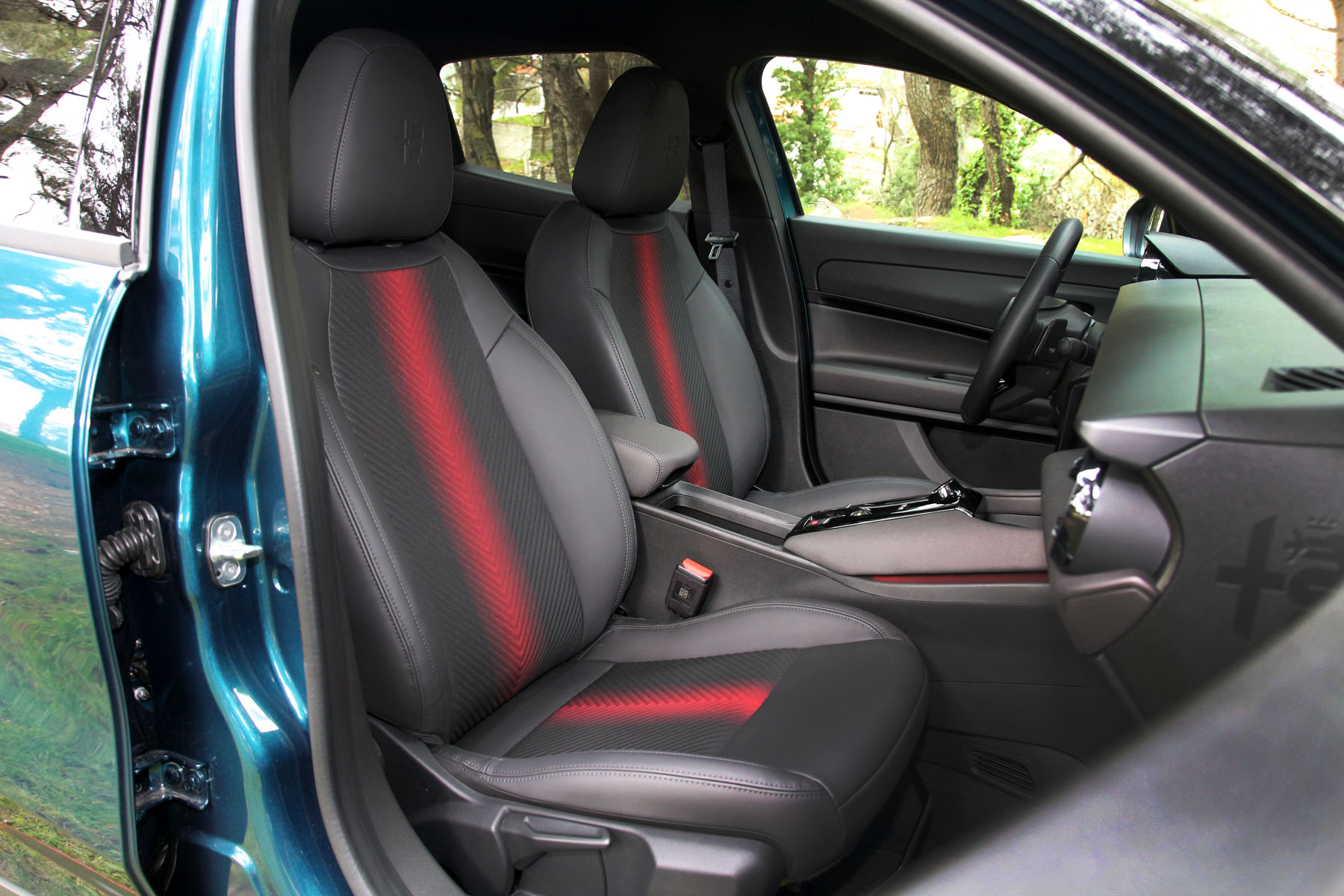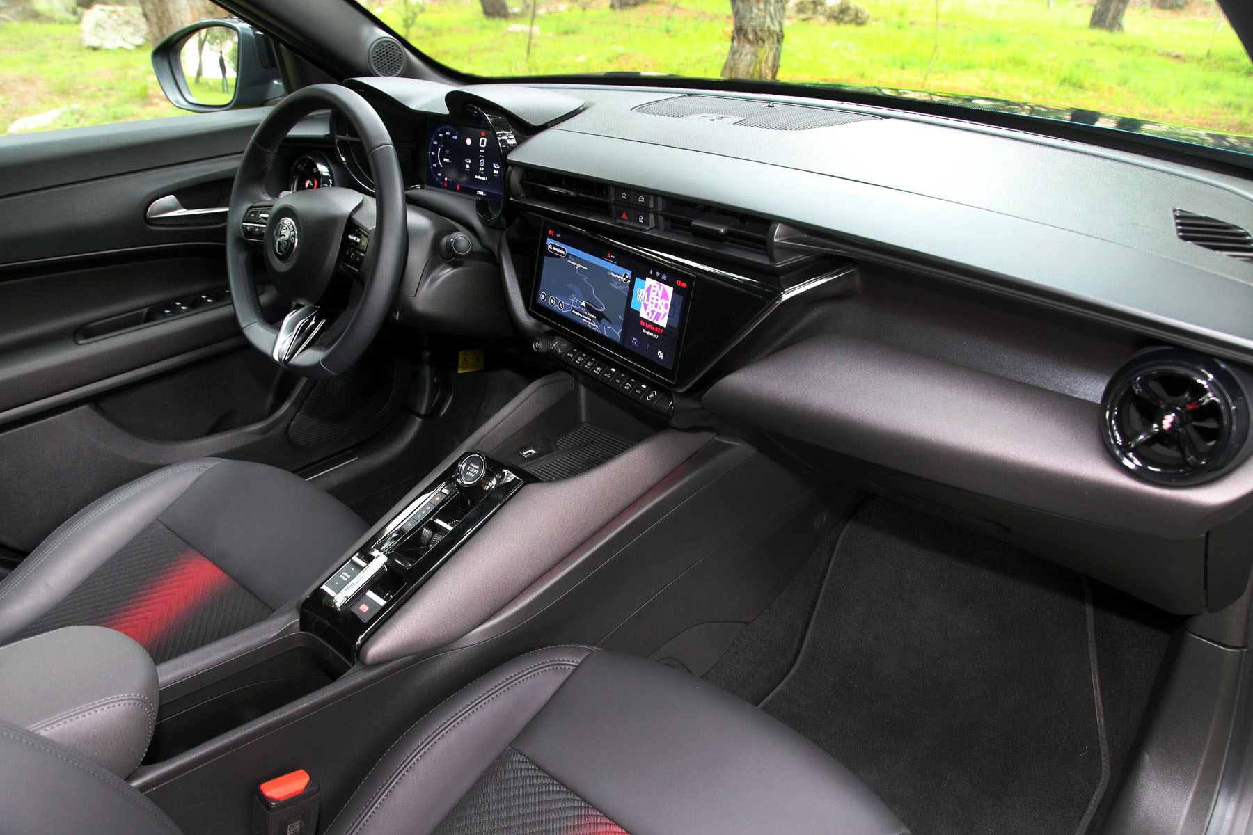 Στο εσωτερικό βέβαια παρατηρούμε ότι η Junior δεν έχει την ίδια ριζοσπαστική προσέγγιση. Κρατάει την οδηγοκεντρική νοοτροπία με την κλίση του ταμπλό, τους κυκλικούς αεραγωγούς και το αντίστοιχο περίγραμμα στον πίνακα οργάνων, ενώ η ιταλική φινέτσα δεν περνά απαρατήρητη στα καθίσματα στο τιμόνι και στην κεντρική κονσόλα.
