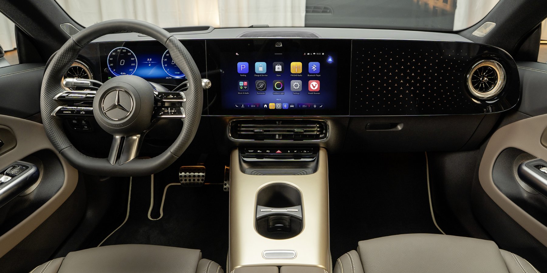 Στο εσωτερικό, κυριαρχεί το νέο MBUX Superscreen, ένα ενιαίο πάνελ με δύο μεγάλες οθόνες: μία 10,25 ιντσών για τον πίνακα οργάνων και μία 14 ιντσών για το infotainment.