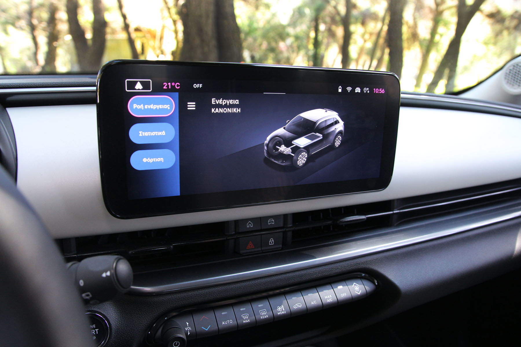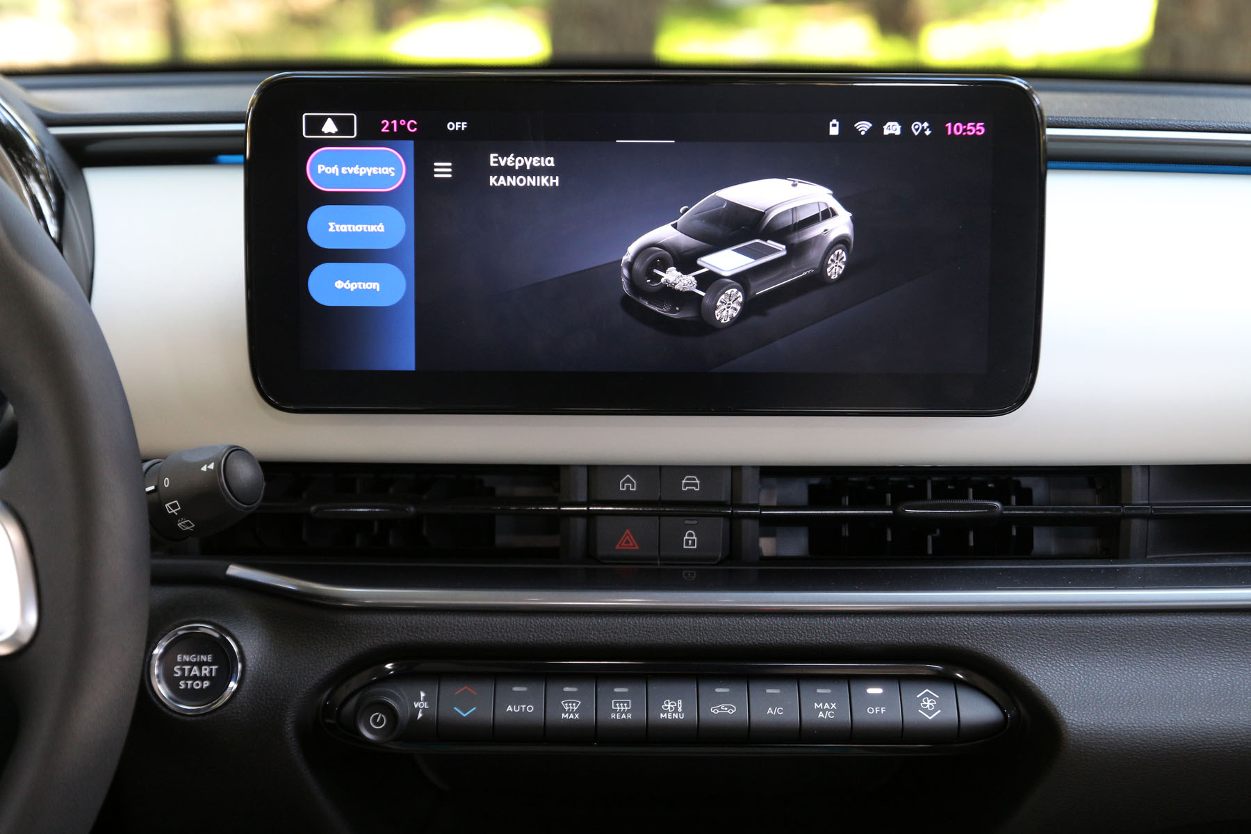 Πίσω από αυτό αντικρίζει κανείς ένα μικρό ψηφιακό πίνακα οργάνων 7” που προβάλλει τις βασικές πληροφορίες ενώ πιο δεξιά, στο κέντρο της κονσόλας, υπάρχει μία ευρυγώνια οθόνη 10,25” για το infotainment.