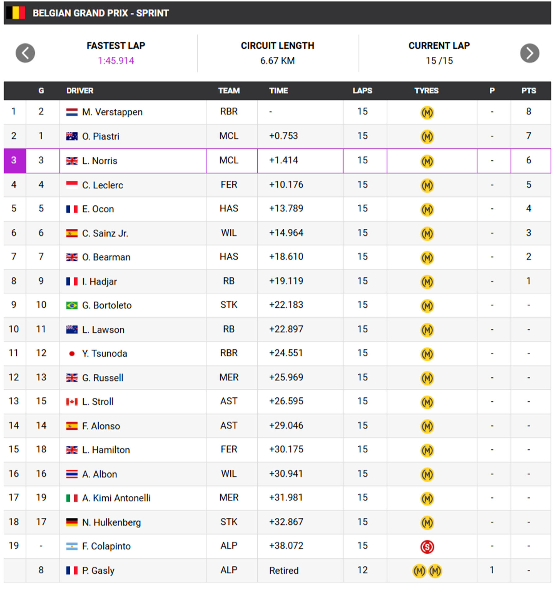 Ο Norris, αν και φαινόταν ταχύτερος, δεν κατάφερε να επιτεθεί στον ομόσταυλό του και περιορίστηκε στην τρίτη θέση. Η διαφορά του Piastri από τον Norris στο πρωτάθλημα οδηγών αυξήθηκε στους 9 βαθμούς.
