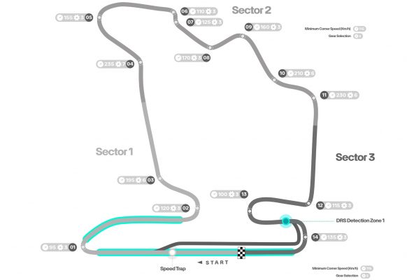 Ζώνες DRS: 2 (ανάμεσα στις στροφές 14–1 και 1–2)