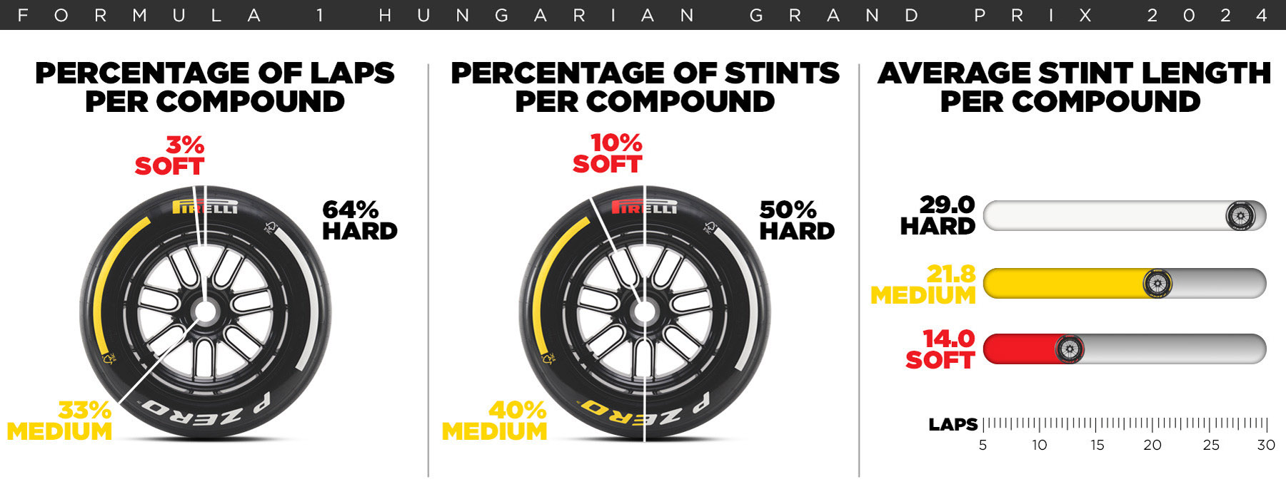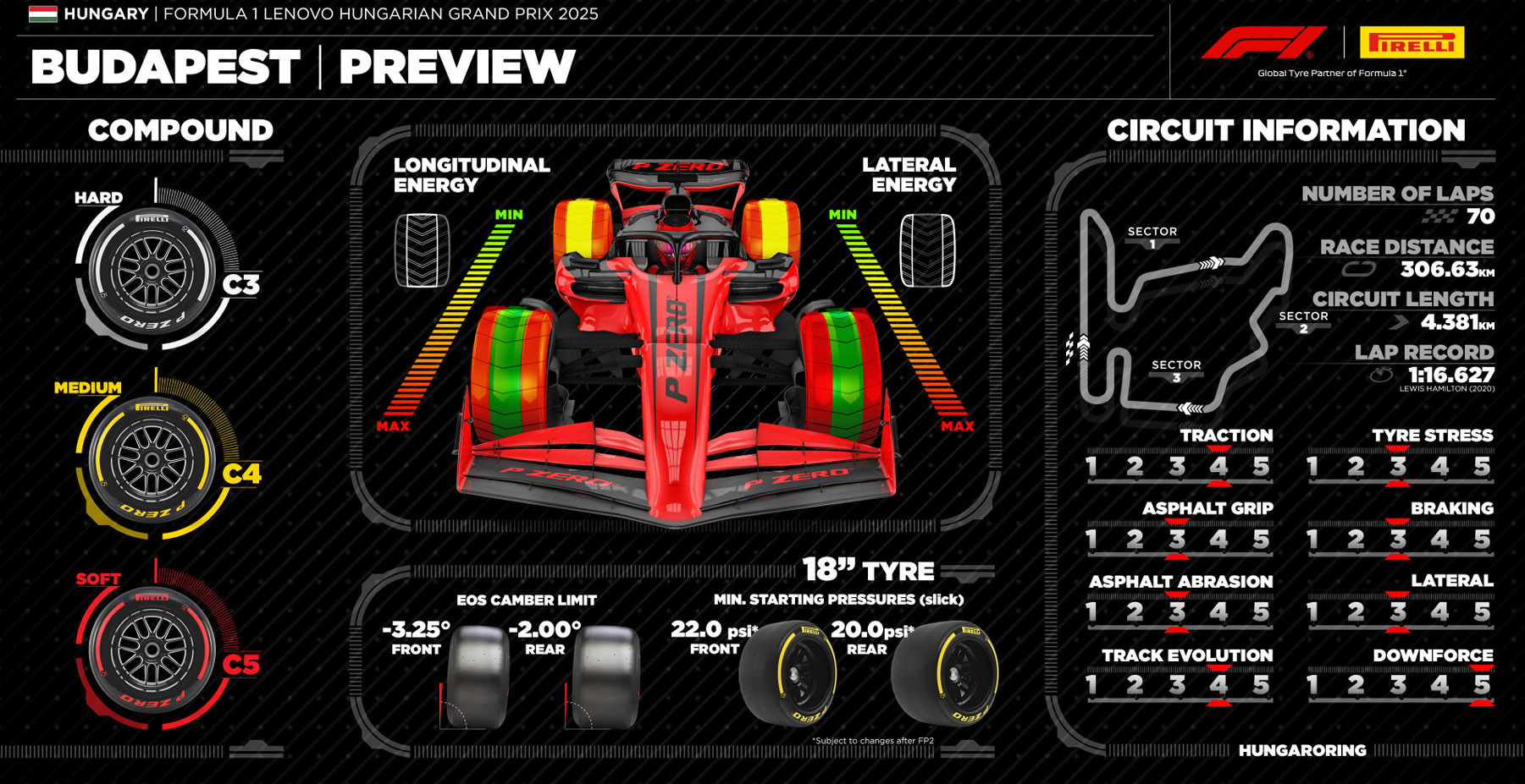 Η Pirelli θα φέρει στη Βουδαπέστη τις πιο μαλακές γόμες της (C3 έως C5), με τη φθορά των ελαστικών να αναμένεται σημαντική, ειδικά αν η θερμοκρασία παραμείνει υψηλή. Η πιθανότητα εμφάνισης αυτοκινήτου ασφαλείας υπολογίζεται στο 20%.