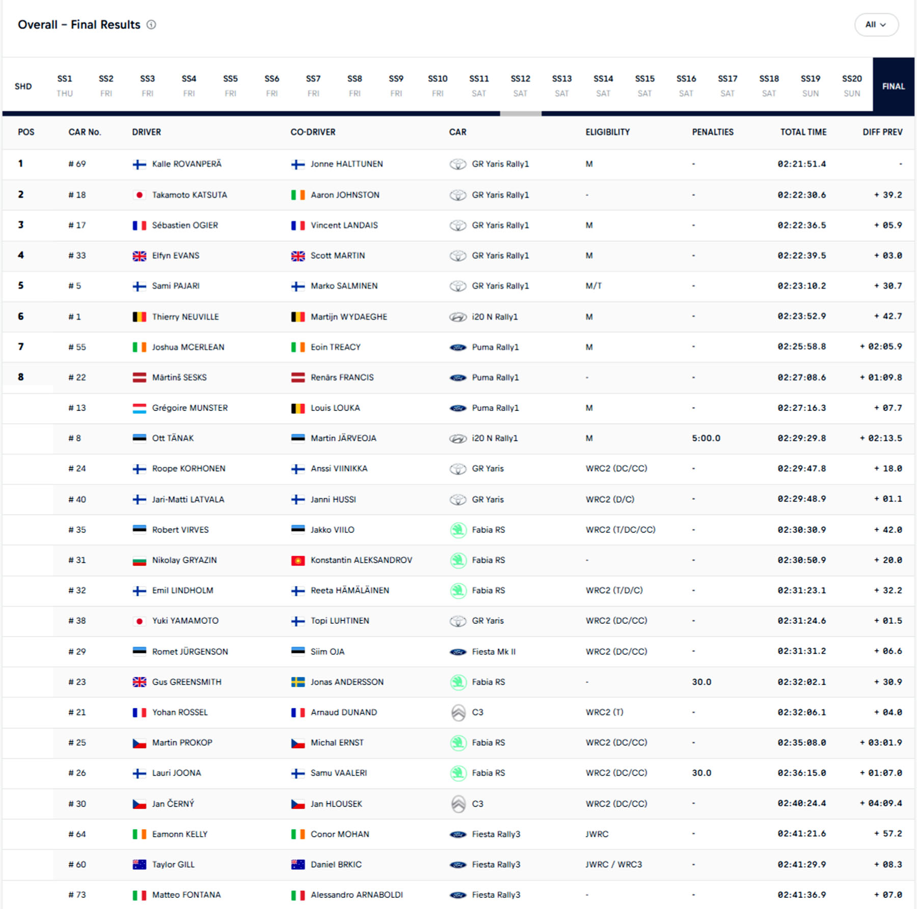 Ο Katsuta πέτυχε το δεύτερο βάθρο του για φέτος, ενώ ο Ogier κατάφερε να εξασφαλίσει την τρίτη θέση με δυνατό φινάλε, παρά το γεγονός ότι δήλωσε πως δυσκολεύτηκε να βρει ρυθμό και ψυχολογία για ρίσκο. Ο Evans, με την τέταρτη θέση και επιπλέον βαθμούς της Super Sunday, πέρασε ξανά στην κορυφή της βαθμολογίας, μόλις τρεις βαθμούς μπροστά από τον Rovanpera.