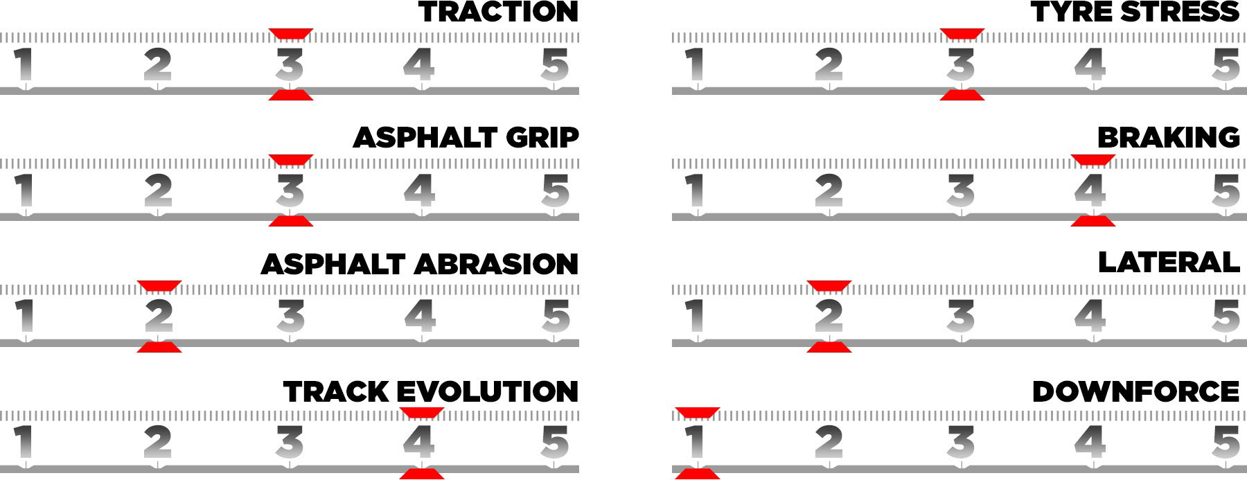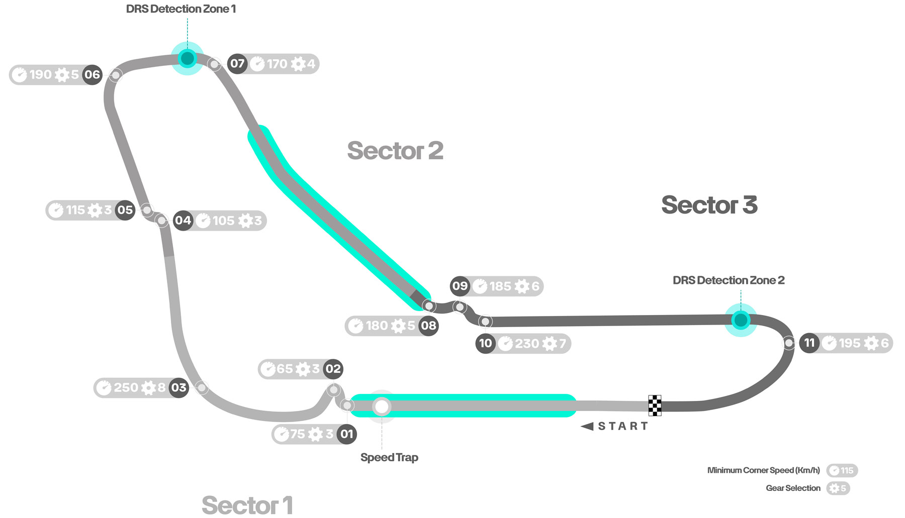 Η διαδρομή των 5,793 χλμ. έχει μέσο όρο ταχύτητας πάνω από 260 χλμ./ώρα στις κατατακτήριες και πάνω από το 80% του γύρου γίνεται με τέρμα γκάζι. Οι οδηγοί φρενάρουν από τα 300+ χλμ./ώρα σε τέσσερα σημεία, με τη σταθερότητα στο φρενάρισμα και την καλή πρόσφυση στην έξοδο από τις στροφές να είναι καθοριστικές.