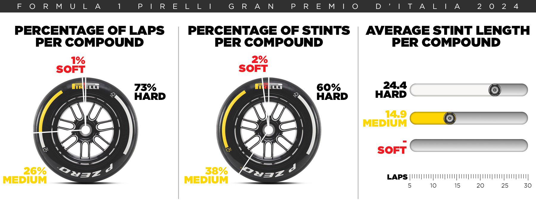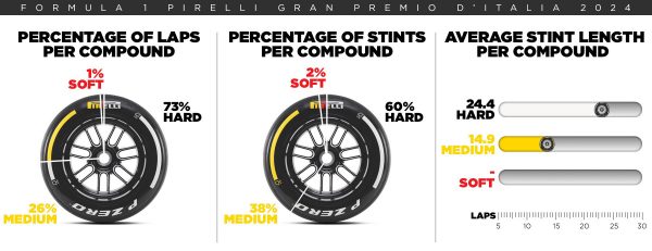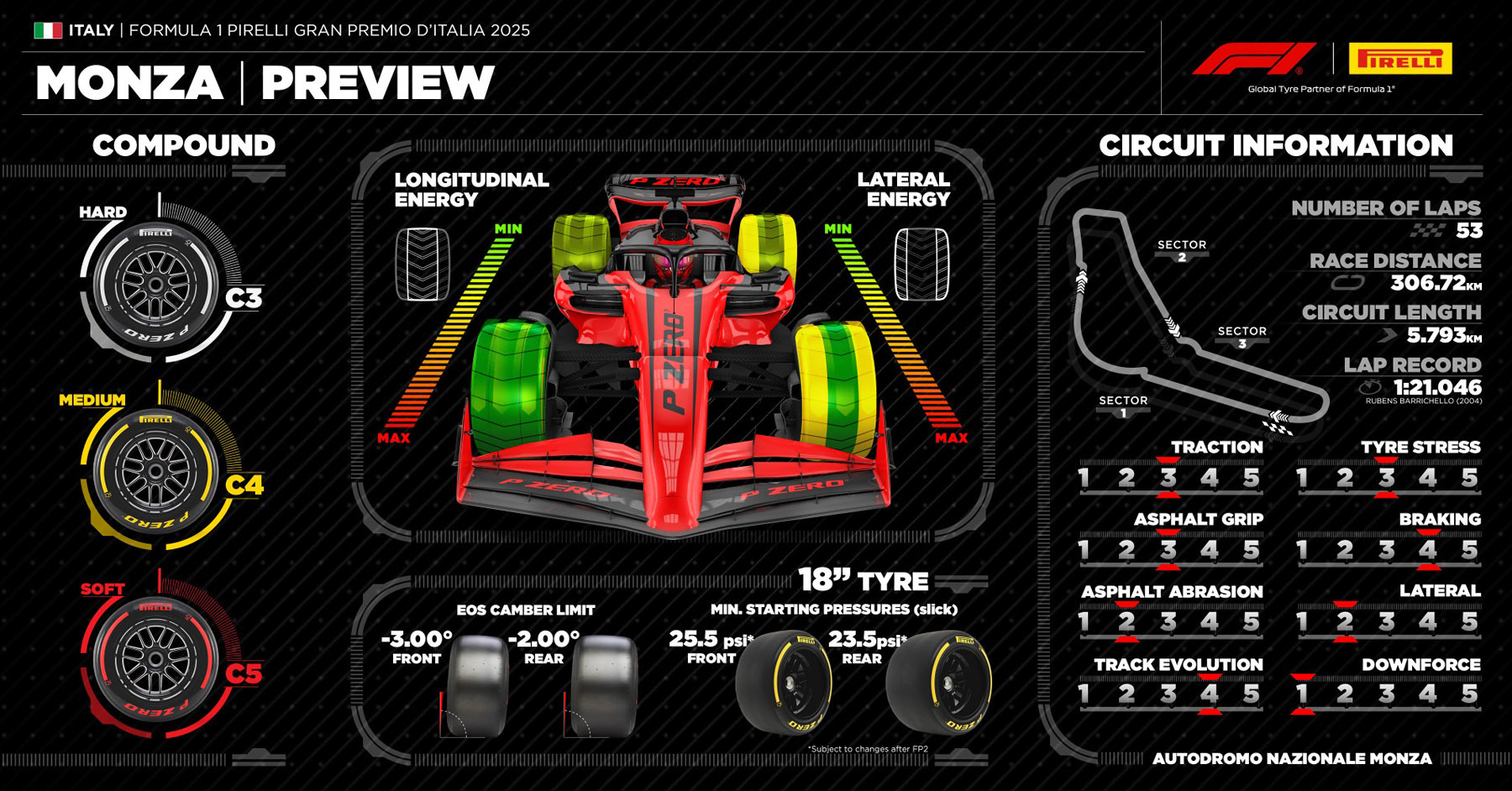 Η Pirelli φέρνει, όπως και το 2024, την πιο μαλακή γκάμα ελαστικών (C3-C4-C5), και όλα δείχνουν πως θα έχουμε αγώνα μιας αλλαγής, όπως και πέρσι, όταν η Ferrari αιφνιδίασε τους αντιπάλους της με μονοστάδιο στρατηγική και κατάφερε να φτάσει στη νίκη.