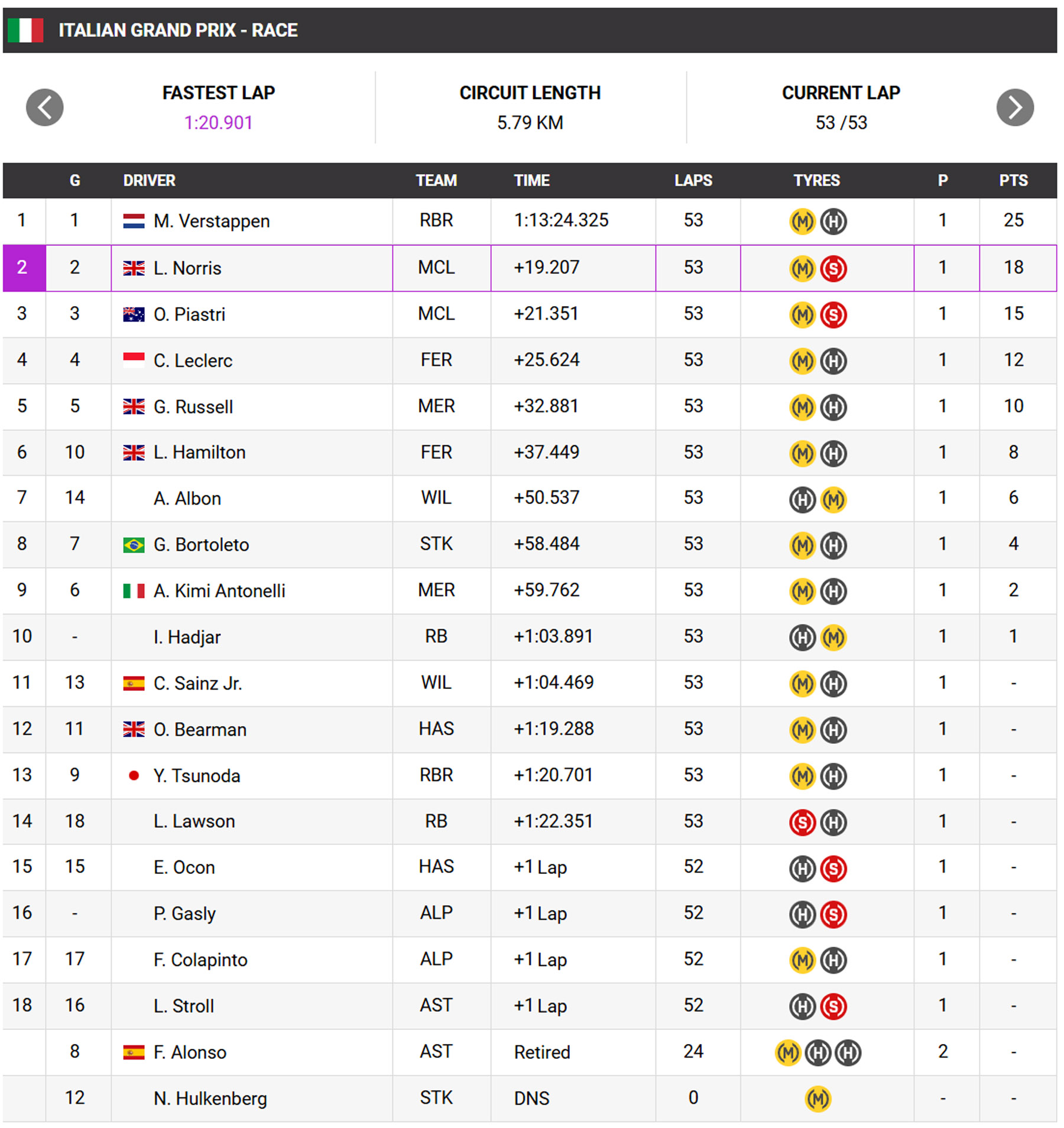Παρακάτω η κατάταξη στη Μόντσα. Επόμενο Grand Prix την μεθεπόμενη Κυριακή, στο Μπακού του Αζερμπαϊτζάν (21 Σεπτεμβρίου, ώρα 14:00)Δείτε εδώ τη βαθμολογία στο πρωτάθλημα.