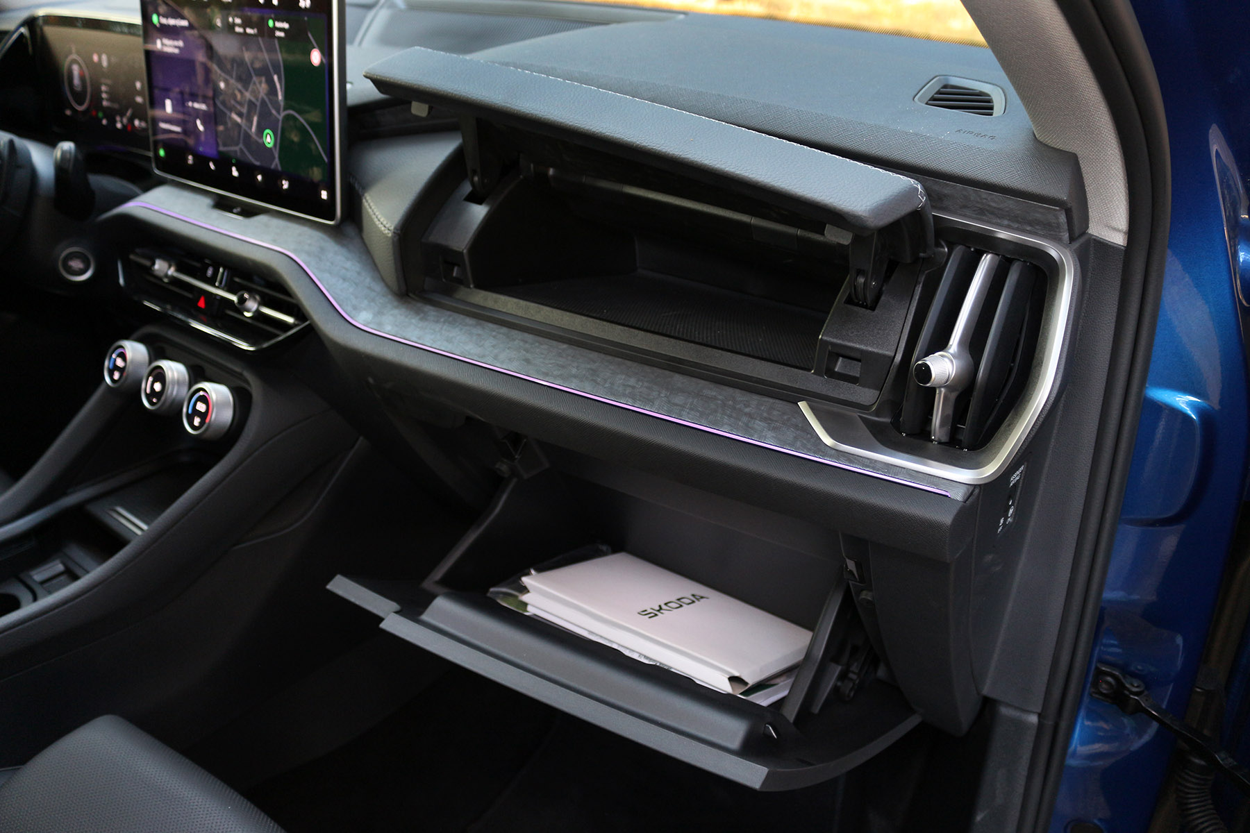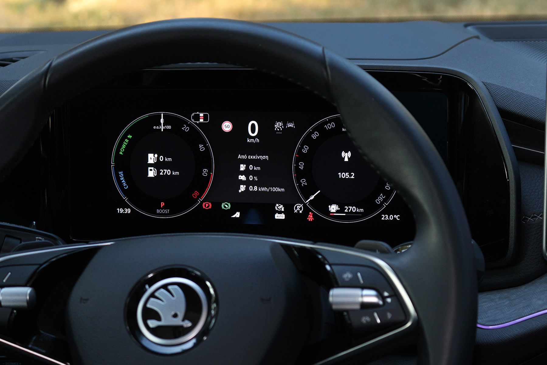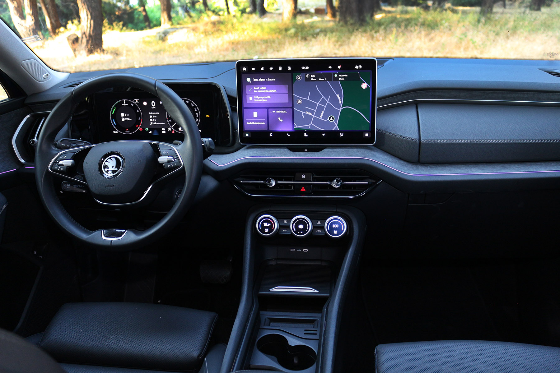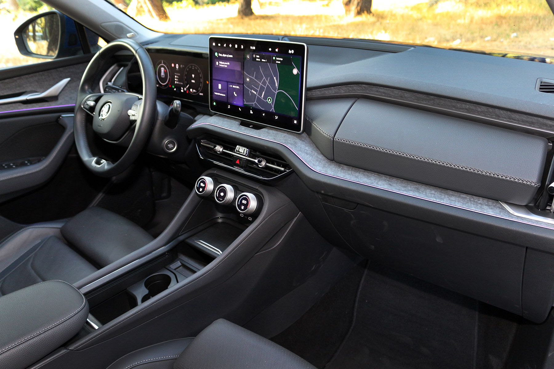 Περνώντας τώρα στο εσωτερικό, τα βήματα εξέλιξης δείχνουν ακόμα περισσότερα. Αρχικά θα πρέπει να αναγνωρίσουμε την ισορροπία που έχουν επιτύχει οι άνθρωποι της Skoda, μεταξύ της ψηφιακής ολοκλήρωσης και της πρακτικότητας στη χρήση. Στο ταμπλό δεσπόζουν δύο οθόνες 10,25” για τον πίνακα οργάνων και 12,9” για το infotainment.