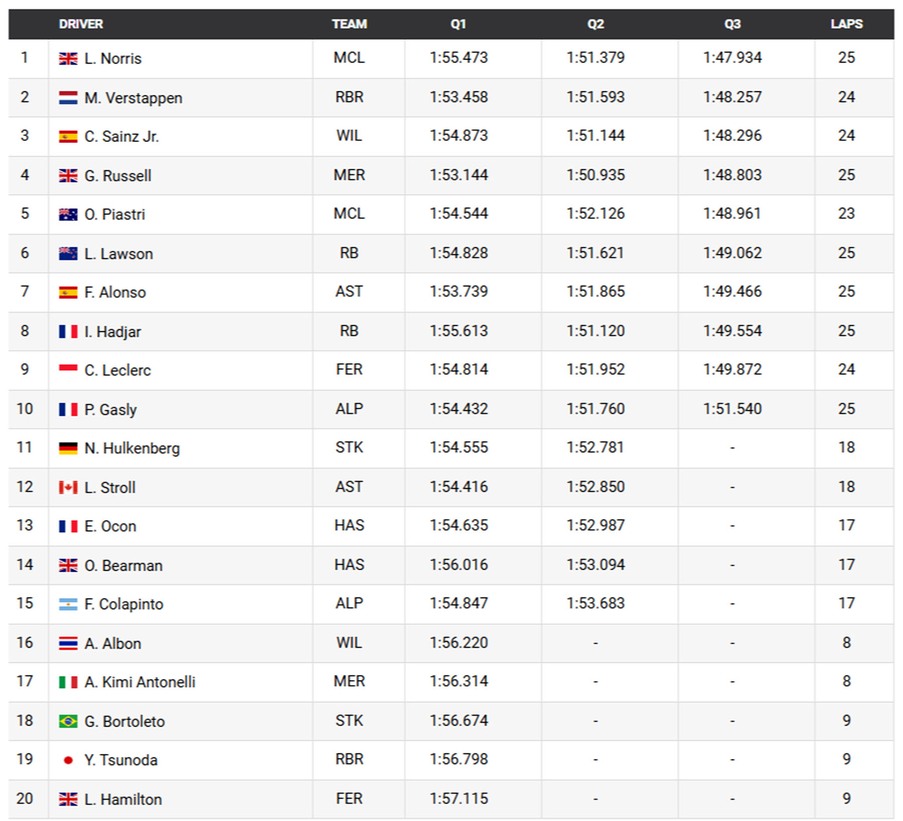 Ο Fernando Alonso ακολούθησε, περίπου τέσσερα δέκατα πίσω, με τον Isack Hadjar μια ανάσα πιο πίσω, ενώ ο Leclerc μετά την έξοδό του δεν κατάφερε να βελτιώσει και έμεινε ένατος. Την πρώτη δεκάδα έκλεισε ο Pierre Gasly.