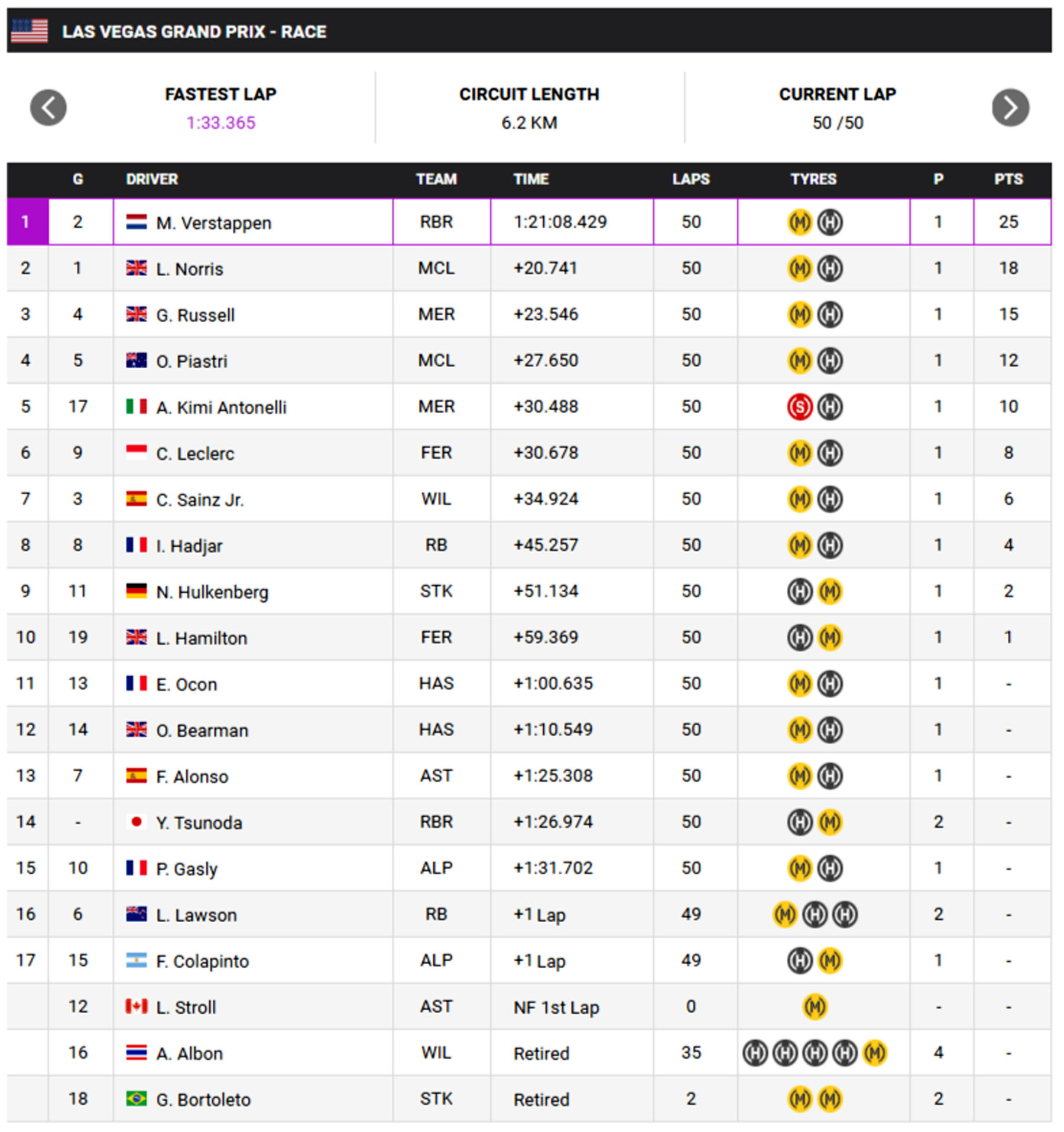 Your points-finishers in Las Vegas ⬇️#F1 #LasVegasGP pic.twitter.com/sCcxsu5YqZ— Formula 1 (@F1) November 23, 2025