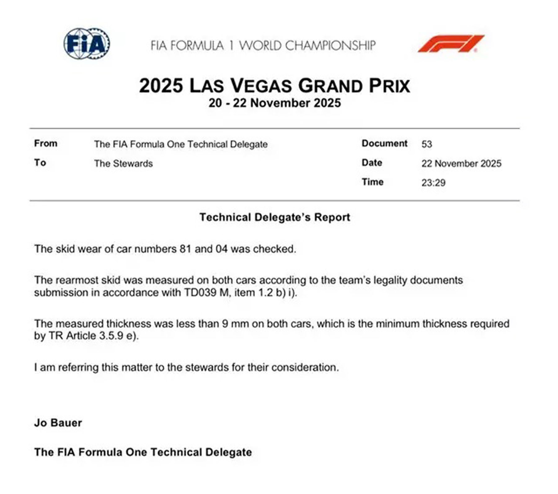 Το Grand Prix της Formula 1 στο Λας Βέγκας ίσως αποκτήσει νέο βάθρο μετά τον τερματισμό, καθώς και τα δύο μονοθέσια της McLaren βρέθηκαν να παραβιάζουν τον κανονισμό περί φθοράς του πατώματος (skid block), κάτι που συνήθως επιφέρει ακύρωση. Συγκεκριμένα, οι Norris και Piastri κλήθηκαν από τους αγωνοδίκες επειδή το πάχος του πίσω μέρους του plank ήταν μικρότερο από τα 9 χιλιοστά που επιτρέπει ο τεχνικός κανονισμός (άρθρο 3.5.9e).