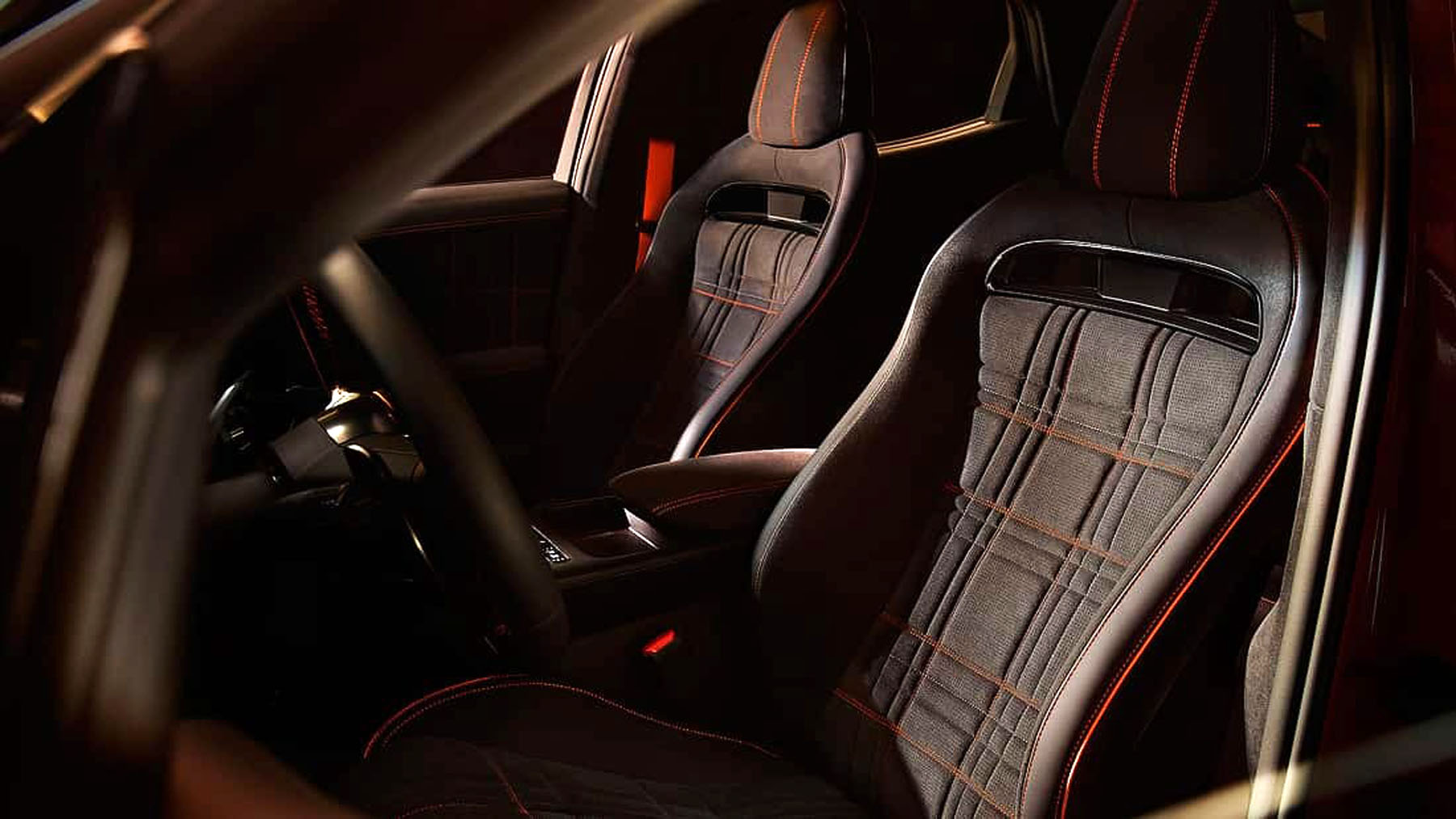 Στο εσωτερικό, το GV60 Magma υιοθετεί πιο δυναμική εικόνα με μικροΐνες, πορτοκαλί λεπτομέρειες και ενσωματωμένα χειριστήρια για boost και επιλογή προγραμμάτων οδήγησης.