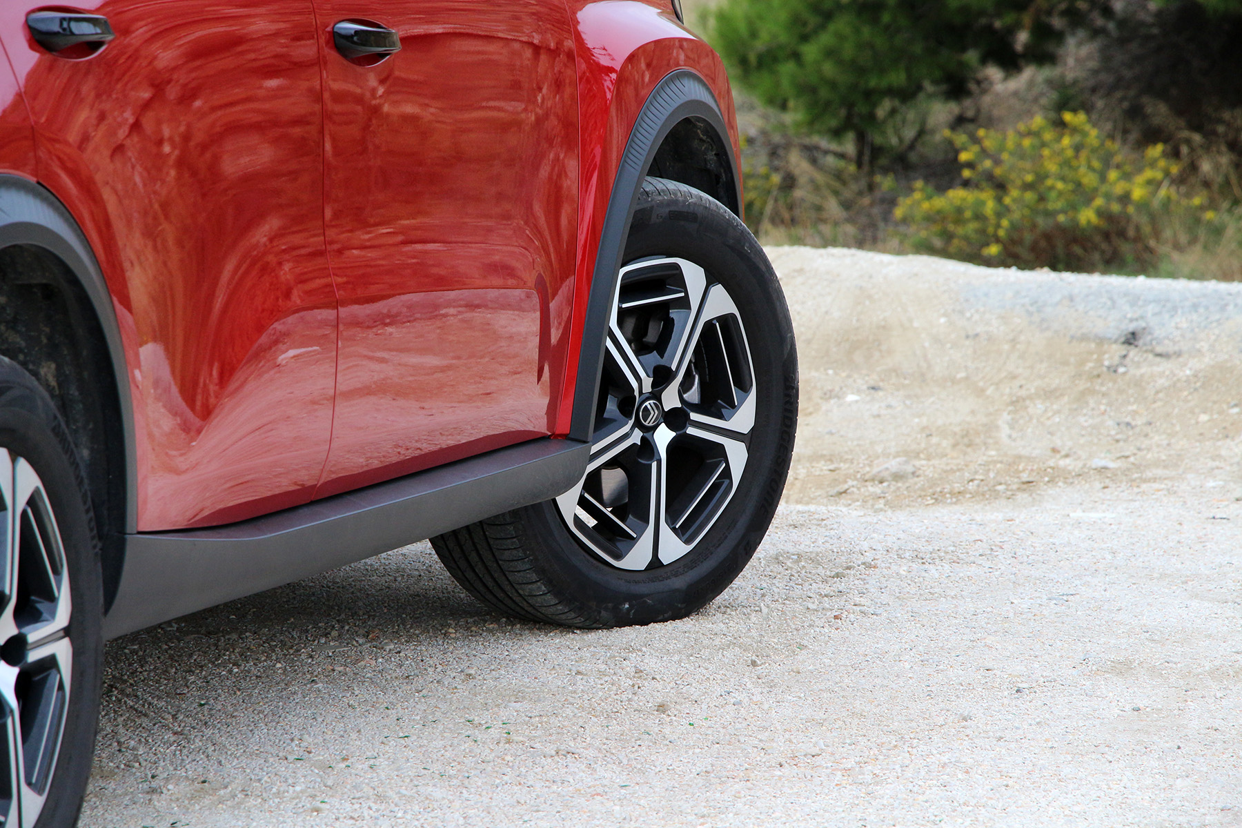 Οι ράγες οροφής, η διχρωμία του αμαξώματος και το ψηλό προφίλ των ελαστικών, μαζί με τα προστατευτικά στους θόλους, επιβεβαιώνουν τον SUV χαρακτήρα που ήθελε να δώσει η Citroen και σίγουρα το κατάφερε και με το παραπάνω στην περίπτωση του Aircross της δοκιμής μας.
