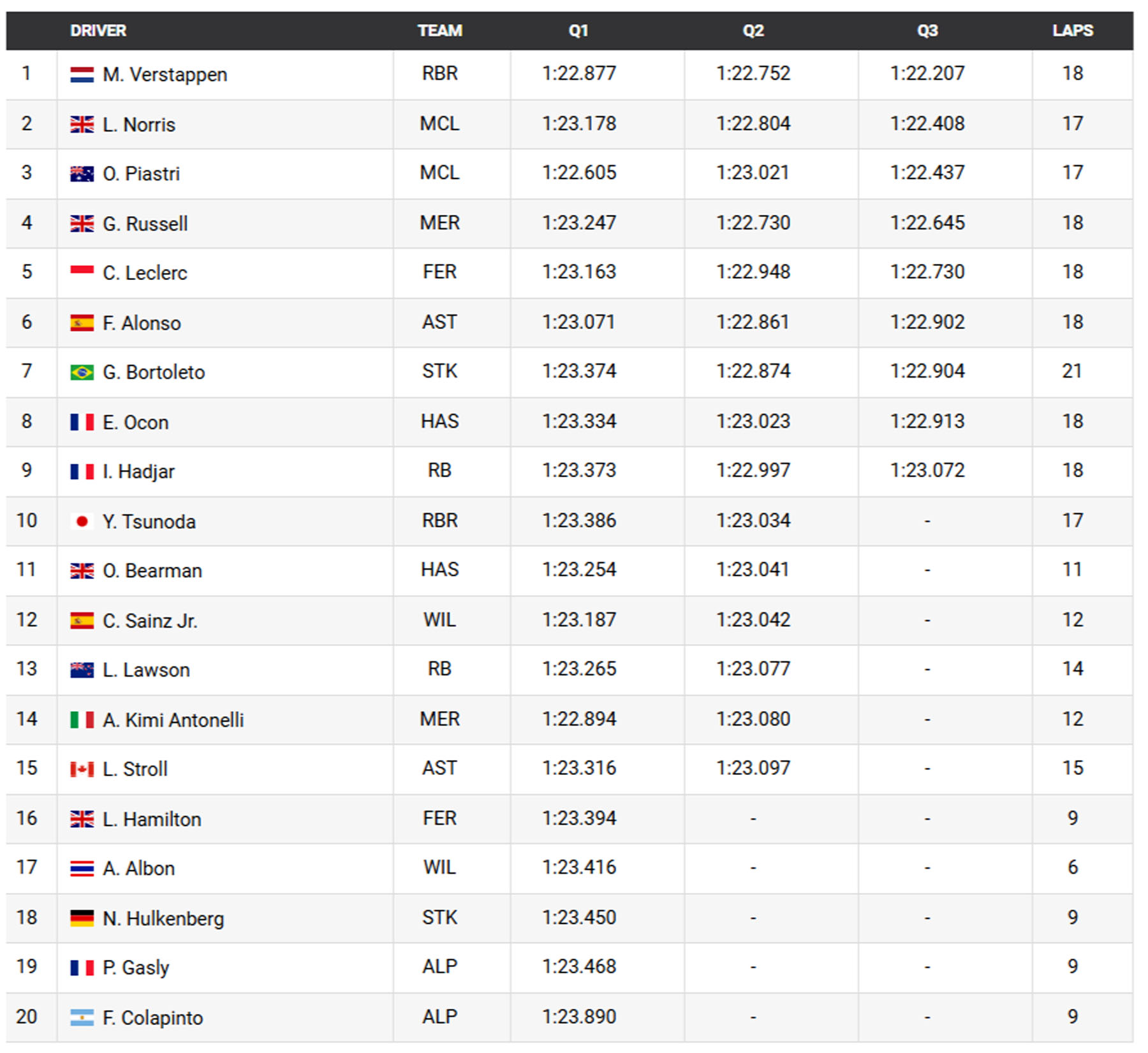 Ο Liam Lawson αποκλείστηκε από το Q3 από τον team-mate του Hadjar, ενώ ο Andrea Kimi Antonelli δεν είχε καλή απόδοση στο τελευταίο κομμάτι της πίστας και έμεινε 14ος. Ο Lance Stroll θα ξεκινήσει 15ος.