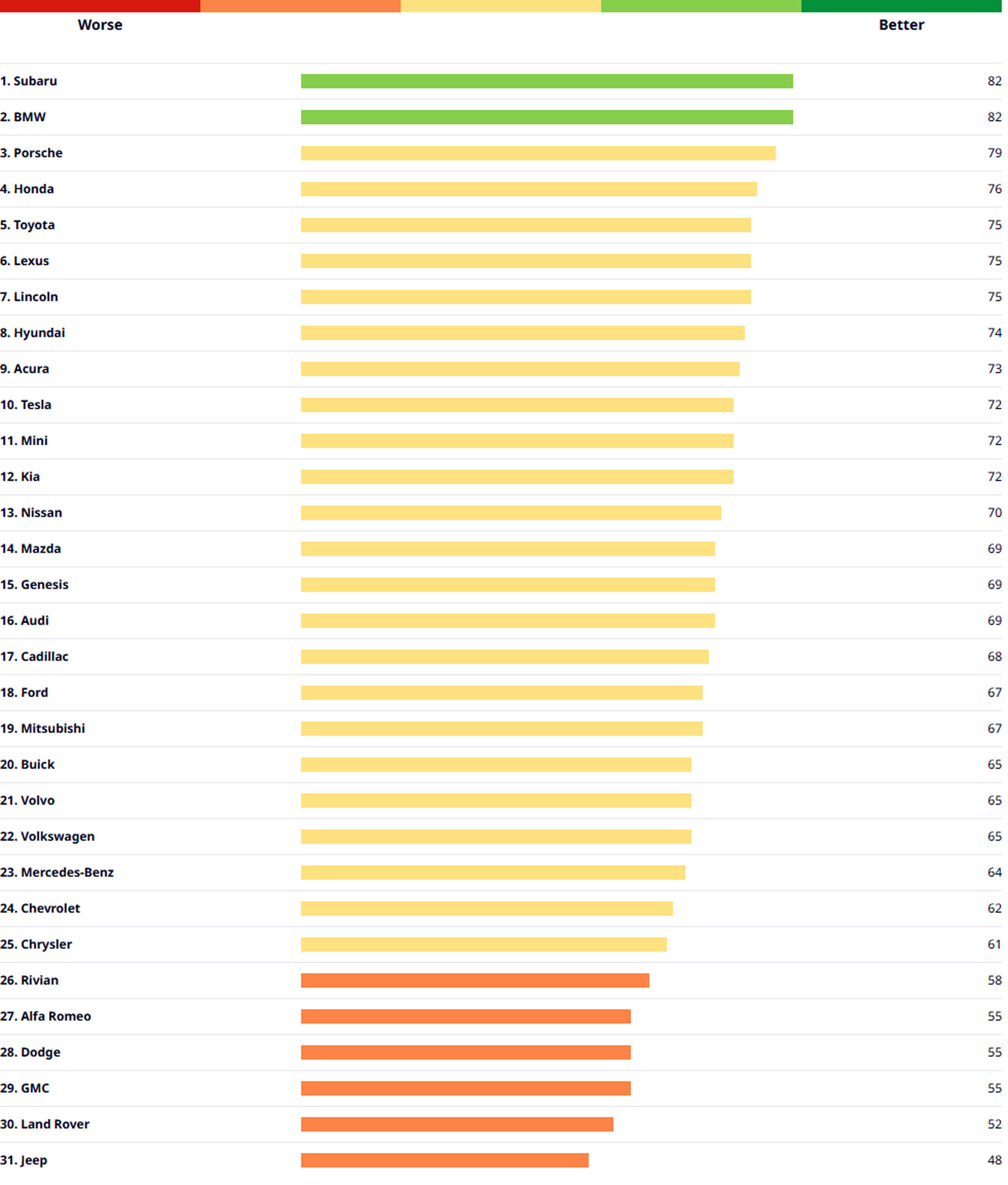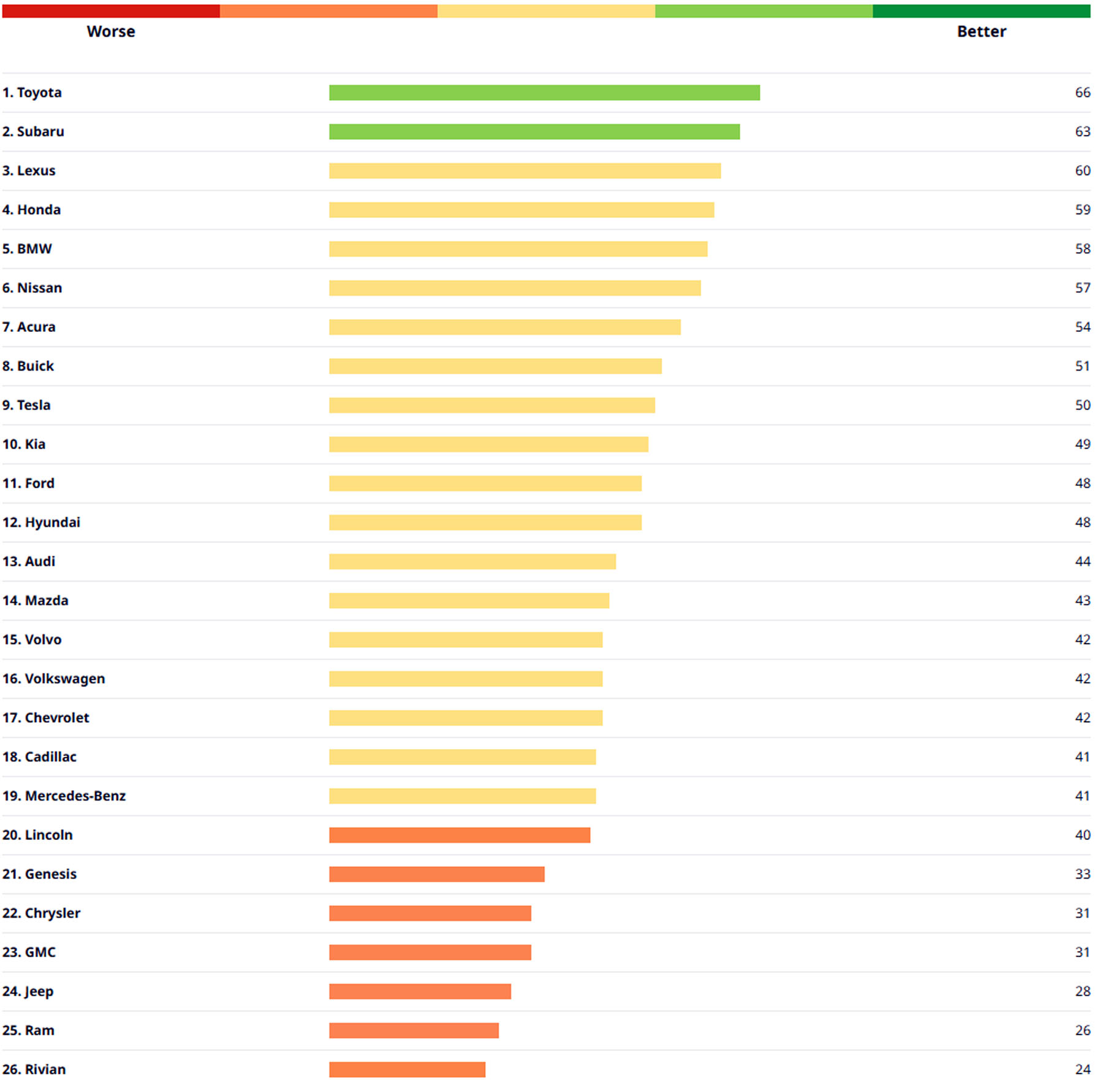 Στο τέλος της κατάταξης για την αξιοπιστία βρίσκονται οι Ram, Rivian, Jeep, Chrysler και GMC. Ο λόγος, σύμφωνα με το Consumer Reports, είναι ότι οι μάρκες που αποφεύγουν ριζικές ανασχεδιάσεις και διατηρούν τα δοκιμασμένα μηχανικά σύνολα, όπως η Subaru και η Toyota, διατηρούν σταθερά υψηλές επιδόσεις στην αξιοπιστία.