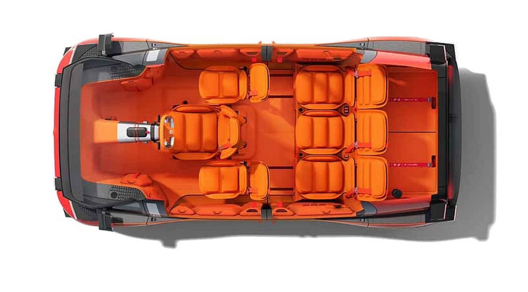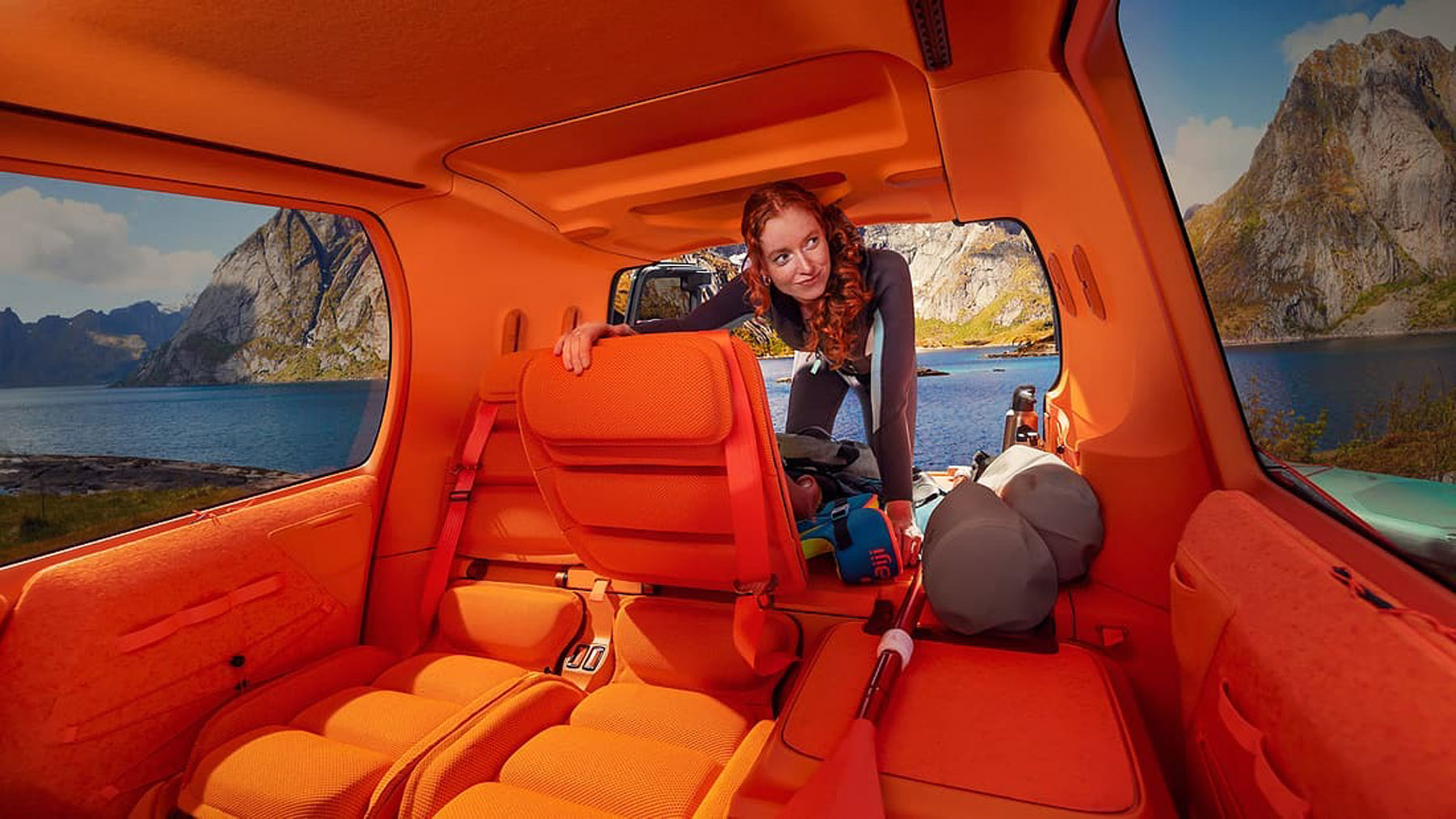 Η δεύτερη σειρά έχει τρία ανεξάρτητα καθίσματα που διπλώνουν ή αφαιρούνται πλήρως, ενώ υπάρχουν ακόμη δύο πτυσσόμενα καθίσματα κάτω από τα πλαϊνά πάνελ. Τα υλικά του σαλονιού προέρχονται από ανακυκλωμένα υφάσματα, περιλαμβάνοντας υπολείμματα από το concept Oli.