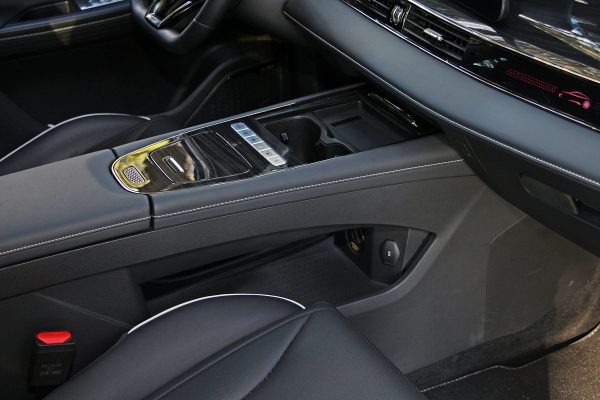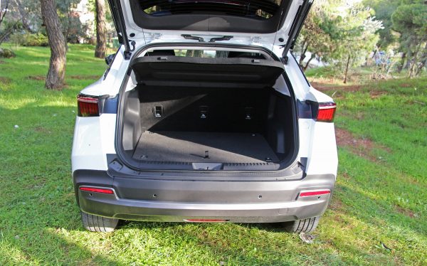 Σχετικά περιορισμένο κρίνεται και το διαμέρισμα των αποσκευών. Η πέμπτη πόρτα ανοίγει ηλεκτρικά, αποκαλύπτοντας ένα απόλυτα τετραγωνισμένο μεν αλλά ρηχό και με χωρητικότητα 360 lt πορτμπαγκάζ. Υπάρχει βέβαια ένα δεύτερο δάπεδο, αυτό όμως είναι περισσότερο για να τακτοποιείς τα καλώδια φόρτισης, άντε και κάνα μικροαντικείμενο ακόμα.