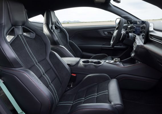 Στο εσωτερικό, η Mustang Dark Horse SC εξοπλίζεται με το δερμάτινο, flat-bottom τιμόνι της GTD με κόκκινη ένδειξη στη θέση 12 η ώρα και κουμπιά επιδόσεων, ενώ οι επιφάνειες ντύνονται με αλκαντάρα και ανθρακονήματα.