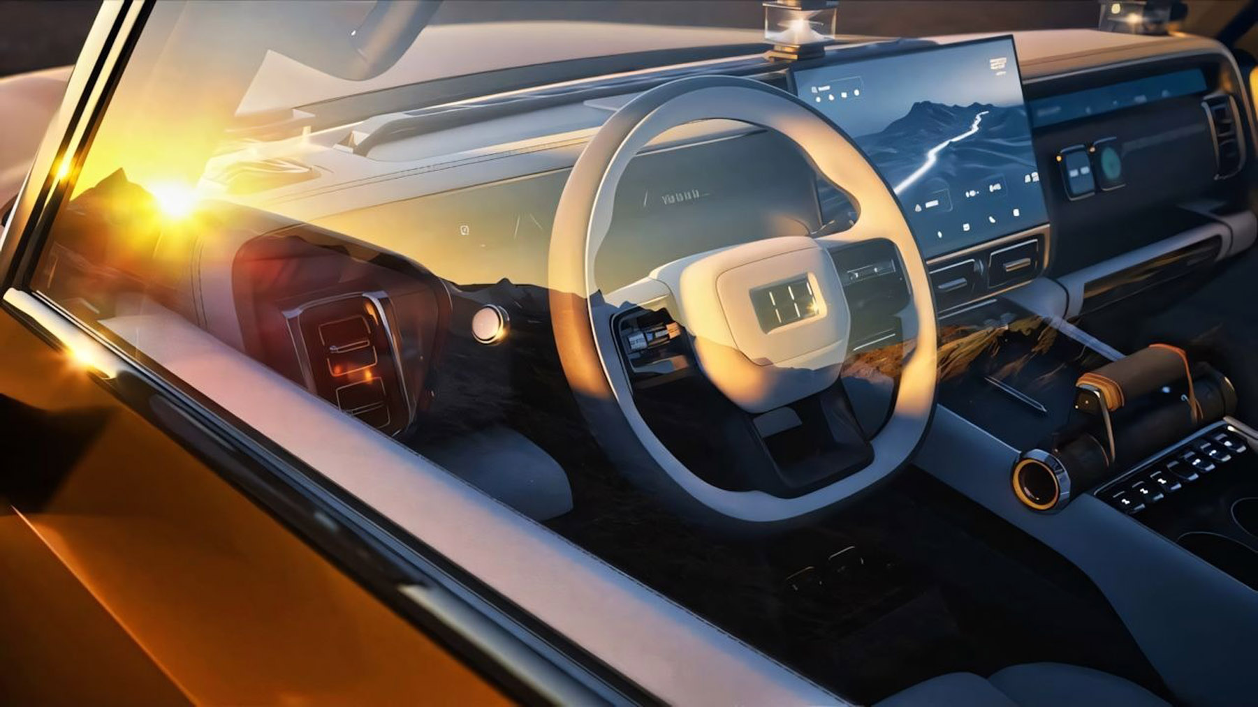 Η καμπίνα διαθέτει μεγάλες ψηφιακές οθόνες, μια ψηλή κεντρική κονσόλα με ειδικές λειτουργίες για εκτός δρόμου διαδρομές και λεπτομέρειες που δίνουν μία πιο «concept» αισθητική. Παρ’ όλα αυτά, η σχεδίαση του εσωτερικού φαίνεται ρεαλιστική και έτοιμη για παραγωγή.
