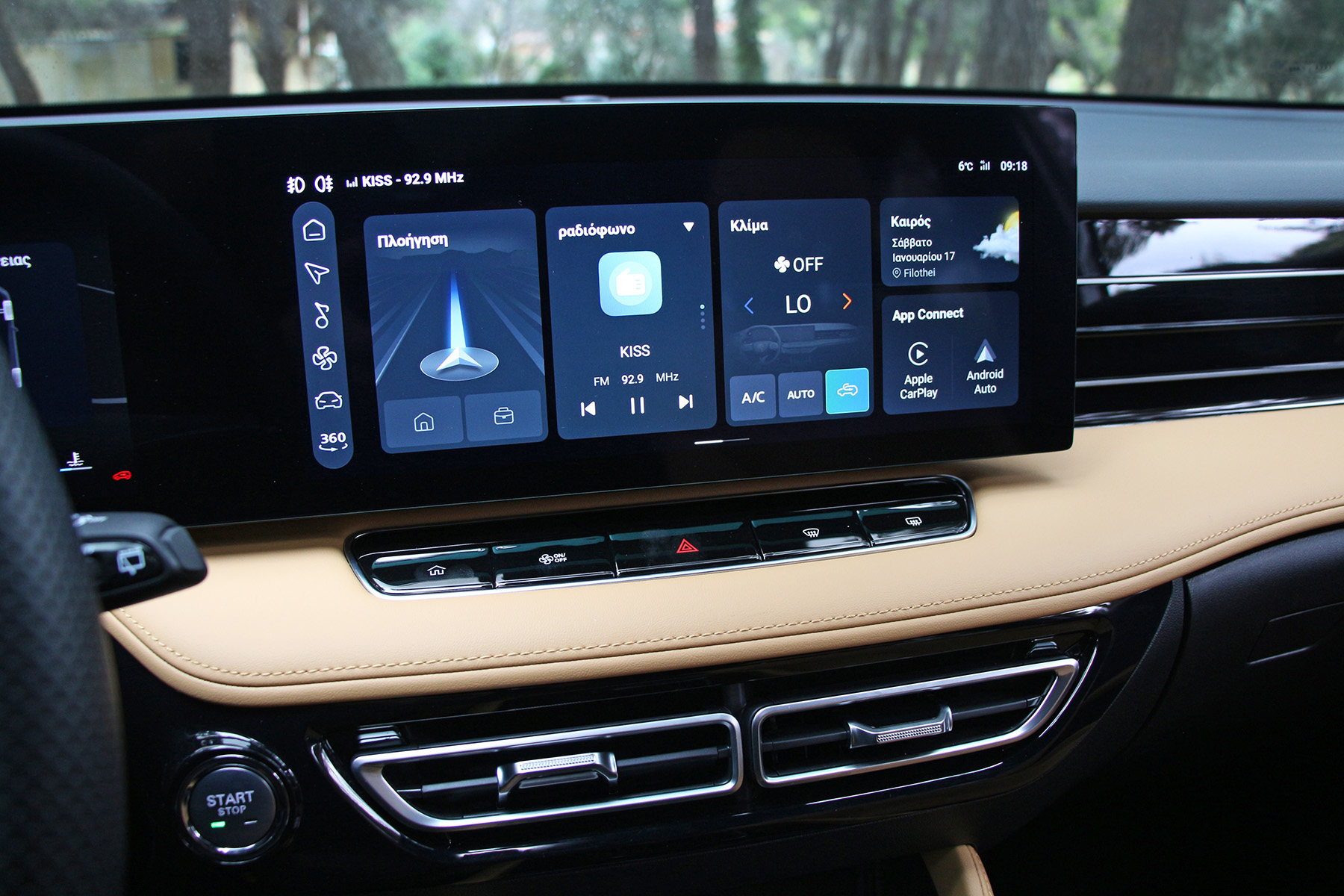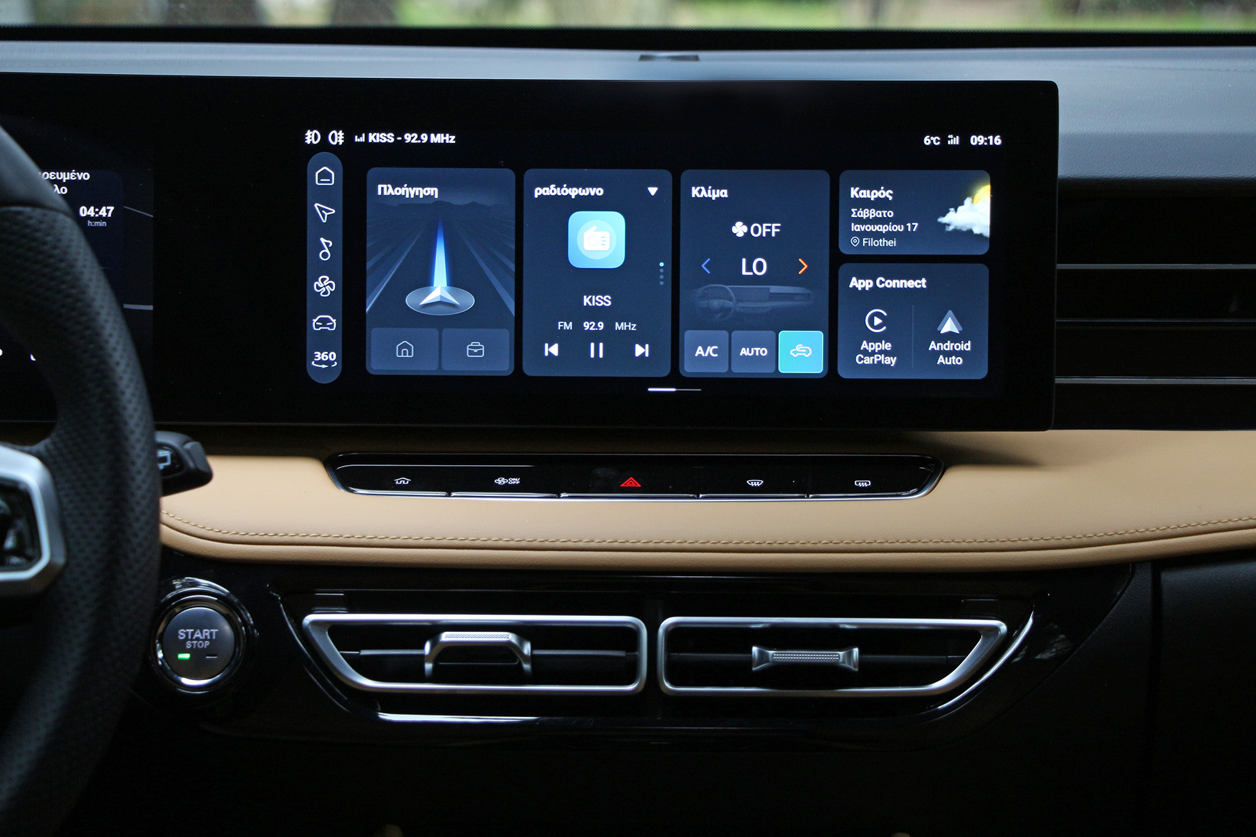 Συνοδεύεται από -πάντα καλοδεχούμενους- φυσικούς διακόπτες για τις βασικές λειτουργίες του κλιματισμού και των alarm (υπάρχουν και άλλοι επάνω στο τιμόνι που κάνουν τη ζωή του οδηγού πιο εύκολη), αλλά και το πλήκτρο «home» που επαναφέρει την τάξη.