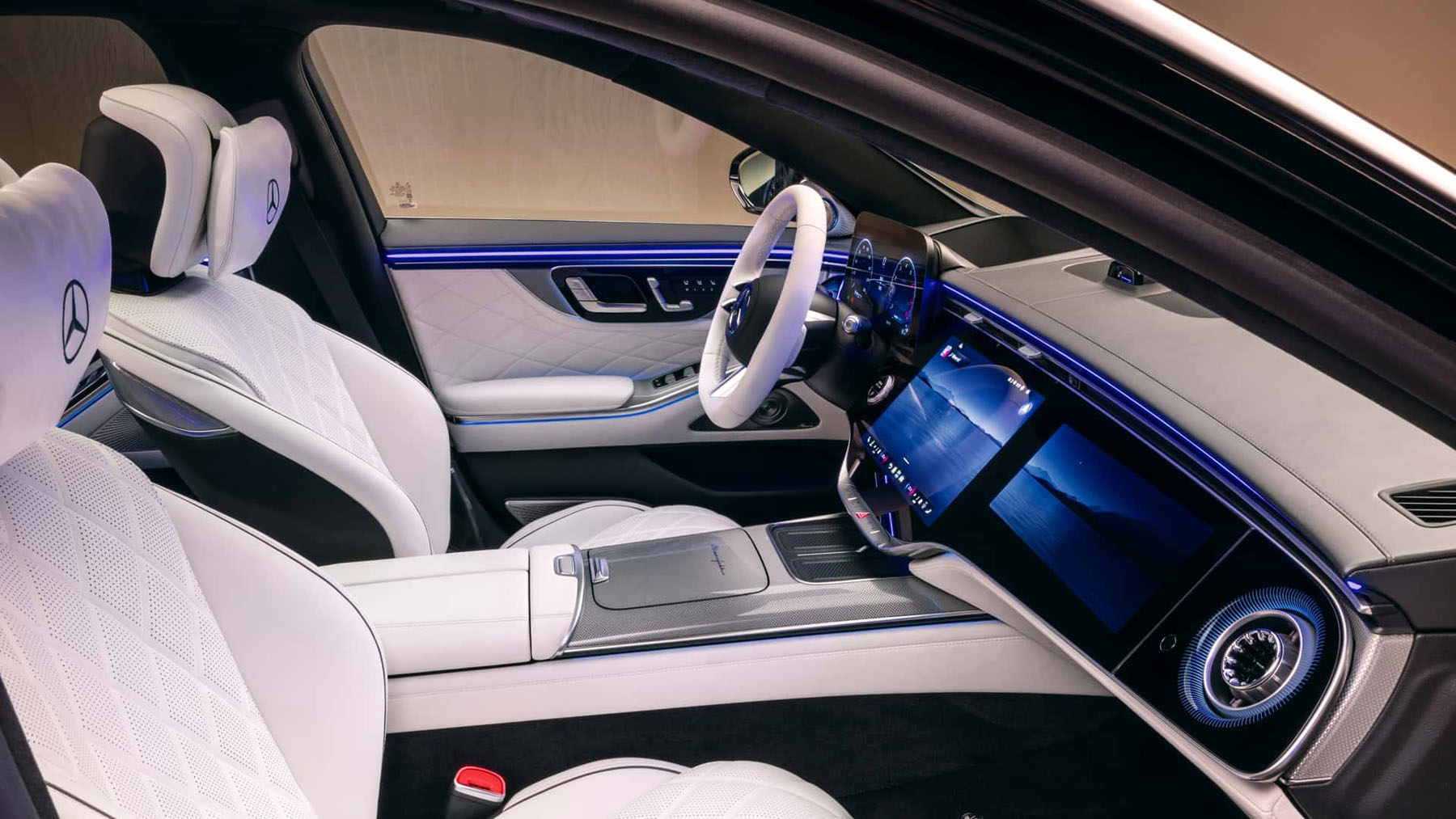 Στο εσωτερικό, η S‑Class εξοπλίζεται πλέον αποκλειστικά με το Superscreen -μια έκδοση του Hyperscreen με τρεις ενσωματωμένες οθόνες- και νέο λογισμικό MB.OS, που συνδυάζει μοντέλα Τεχνητής Νοημοσύνης από ChatGPT, Google Gemini και Microsoft Bing.
