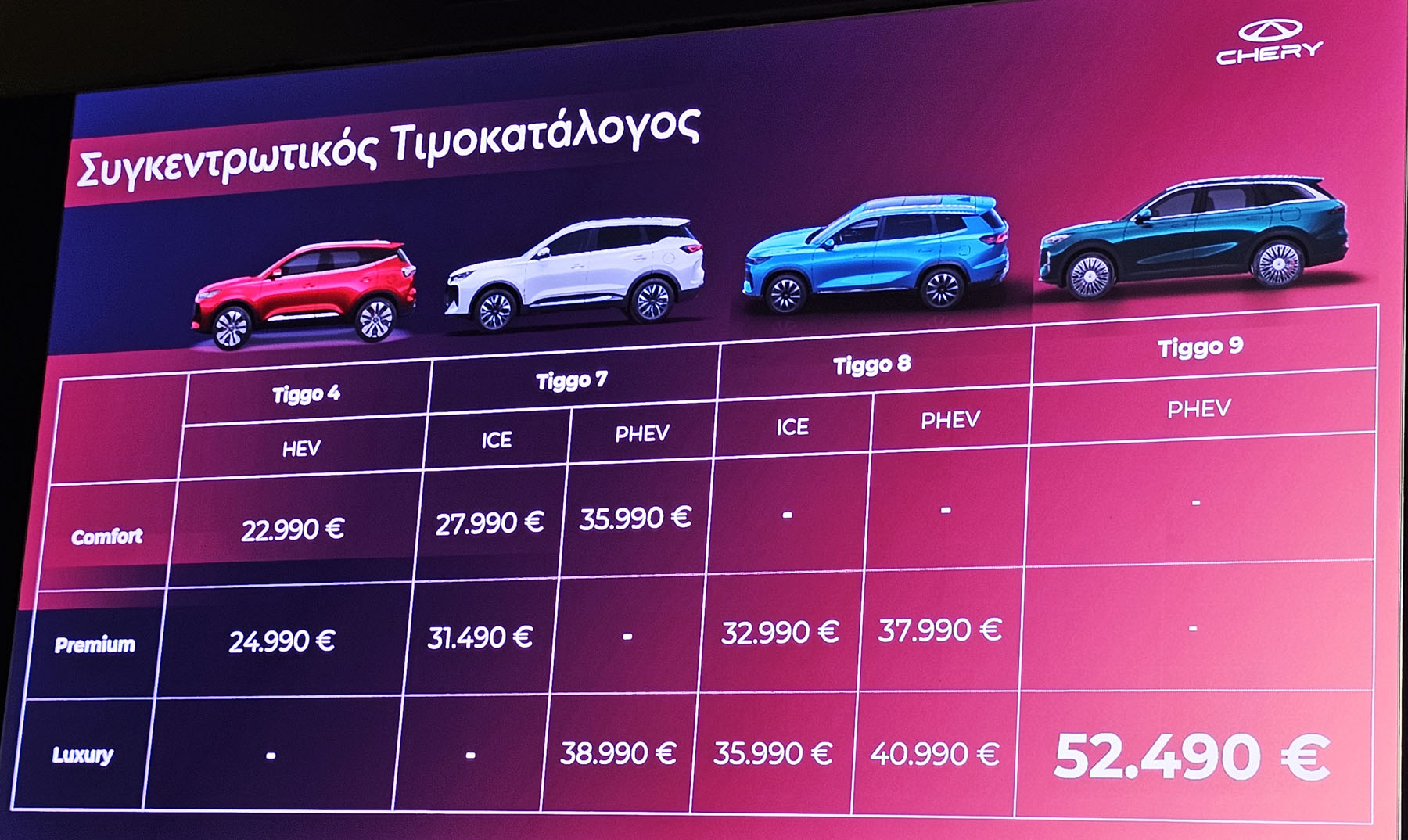 Η παρουσία της Chery στην ελληνική αγορά είναι ακόμη πρόσφατη, ωστόσο τα πρώτα δείγματα γραφής δείχνουν ξεκάθαρα τις προθέσεις της. Με τα Tiggo 4, Tiggo 7 και Tiggo 8 έχει ήδη καλύψει βασικές κατηγορίες SUV και τώρα περνά στο επόμενο επίπεδο, παρουσιάζοντας το Tiggo 9 AWD, το μεγαλύτερο και τεχνολογικά πιο προηγμένο αυτοκίνητο της γκάμας της.