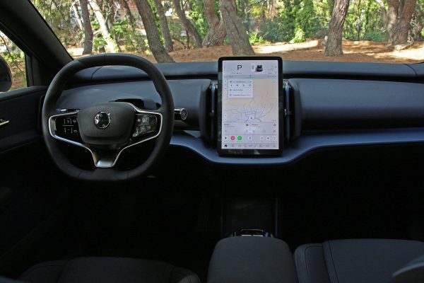 Δεν υπάρχει πίνακας οργάνων πίσω από το τιμόνι, δεν υπάρχουν φυσικοί διακόπτες για τον κλιματισμό, ούτε καν για τη ρύθμιση των καθρεπτών. Τα πάντα ελέγχονται από την κεντρική οθόνη 12,3 ιντσών, η οποία λειτουργεί με λογισμικό Google Built-in.