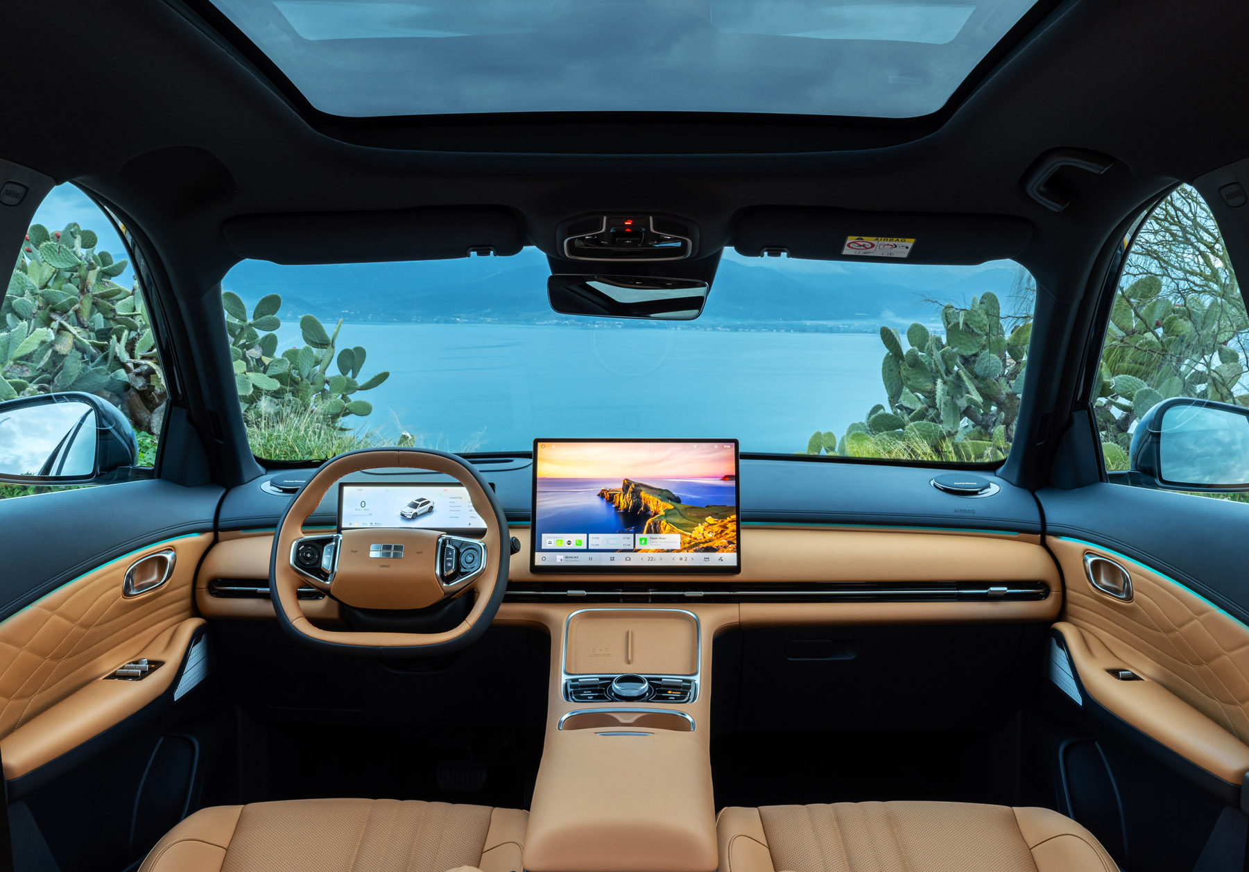 Ο διάκοσμος έχει μία έντονη αύρα από την προσεγμένη και ποιοτικλή προσέγγιση της Geely, με υλικά που θυμίζουν ανώτερες κατηγορίες και έξυπνες λύσεις εργονομίας.