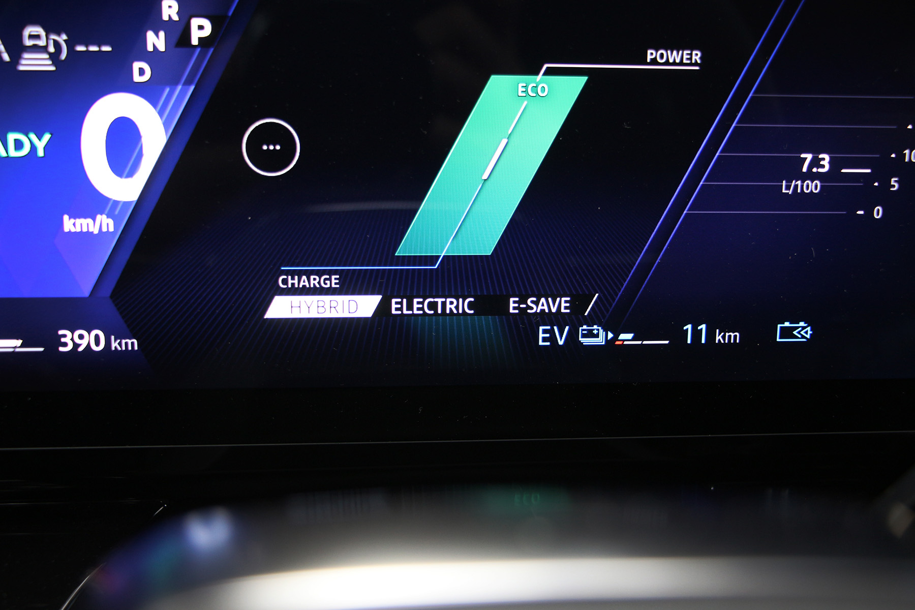 Μέσω ενός μπουτόν EV MODE μπορεί κανείς να επιλέξει την υβριδική λειτουργία (by default), μία αμιγώς ηλεκτρική ή την E-save που διατηρεί ένα ποσοστό ηλεκτρικής ενέργειας πάντα διαθέσιμο.