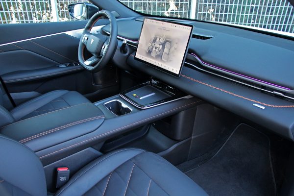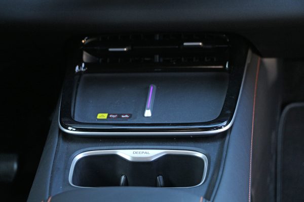 Η μεγάλη ενιαία κονσόλα ανάμεσα στους εμπρός επιβάτες λειτουργεί σαν τέλειο υποβραγχιόνιο με καλό χώρο, ενώ η συνέχεια της καταλήγει σε δύο θέσεις για το smartphone με ταχεία ασύρματη φόρτιση 50kW.