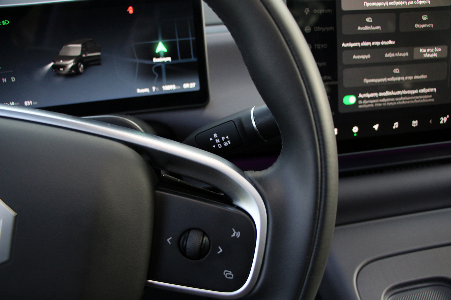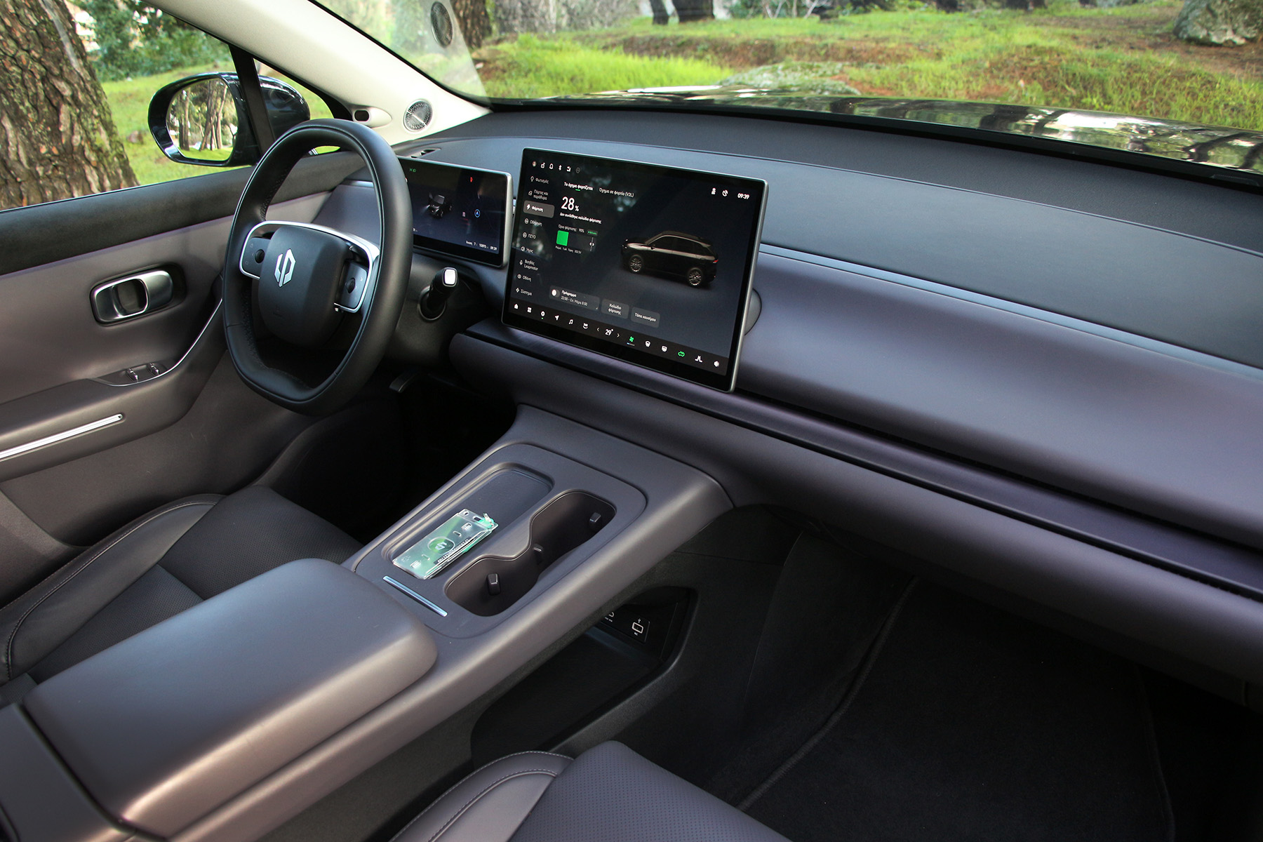 Στο ταμπλό δε βλέπεις σχεδόν τίποτα πέρα από τη μεγάλη ψηφιακή οθόνη 14,6 ιντσών (μέχρι και οι αεραγωγοί είναι καλά κρυμμένοι), ενώ πίσω από το τιμόνι φιγουράρει και ο ψηφιακός πίνακας οργάνων 10,25 ιντσών.