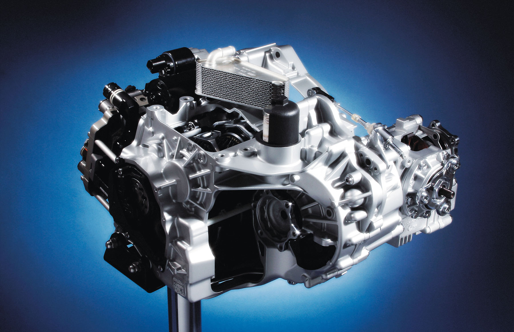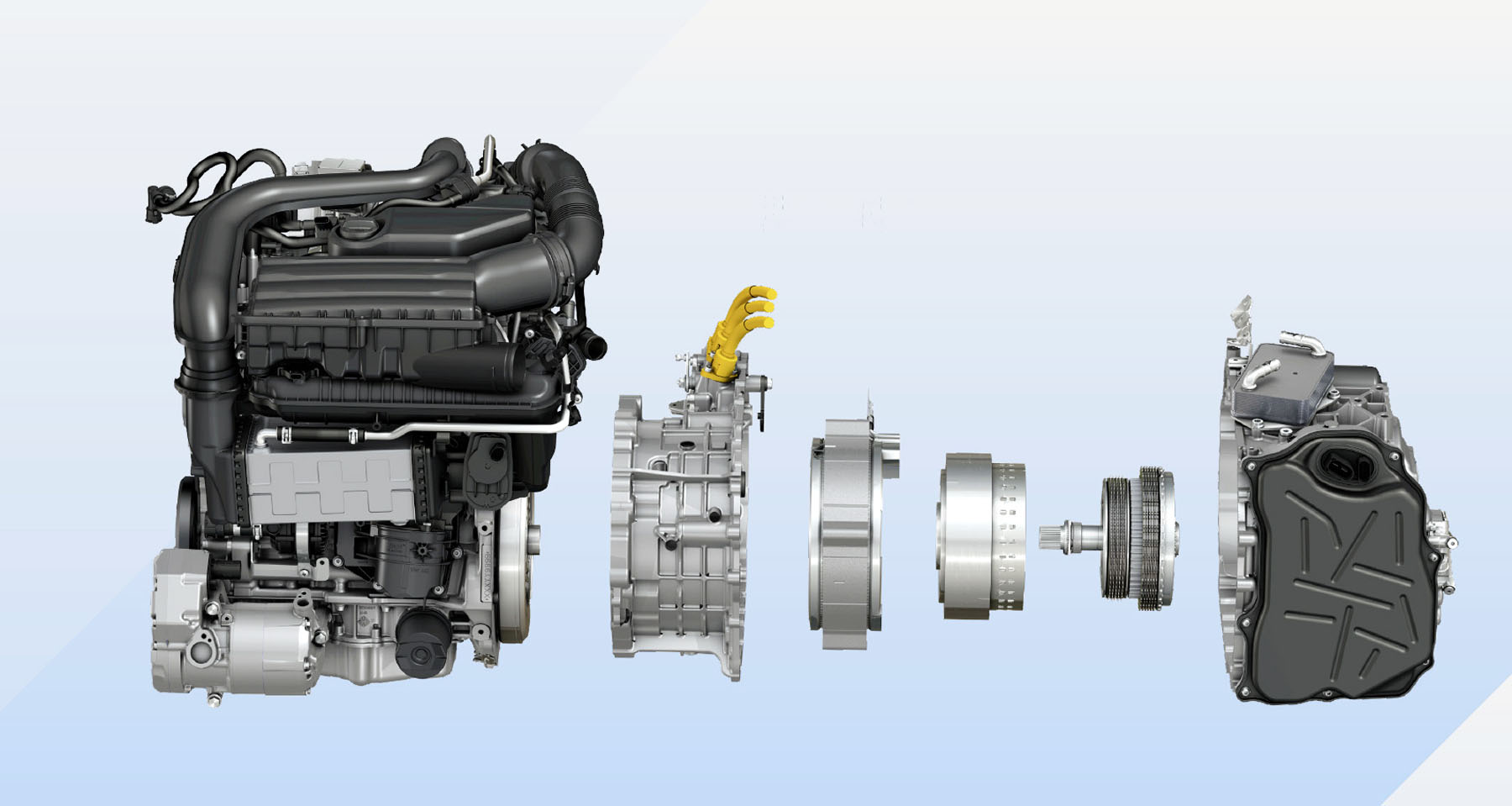 The eHybrid drive: the new 1.5 TSI evo2 on the left, the new DQ400e on the right. The electric drive motor and the DSG are combined in the DQ400e (five components from right)