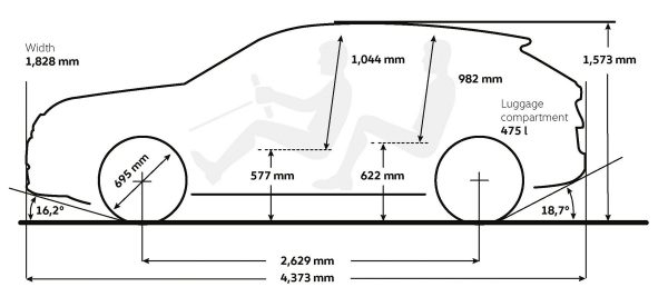 Σχετικά με τις διαστάσεις, το μήκος φτάνει τα 4.373 χλστ., το πλάτος τα 1.828 χλστ. (χωρίς καθρέφτες), το ύψος τα 1.573 χλστ. και το μεταξόνιο τα 2.629.. Ο χώρος αποσκευών ανέρχεται στα 475 λίτρα και επεκτείνεται έως τα 1.350 λίτρα με αναδιπλωμένα τα πίσω καθίσματα.