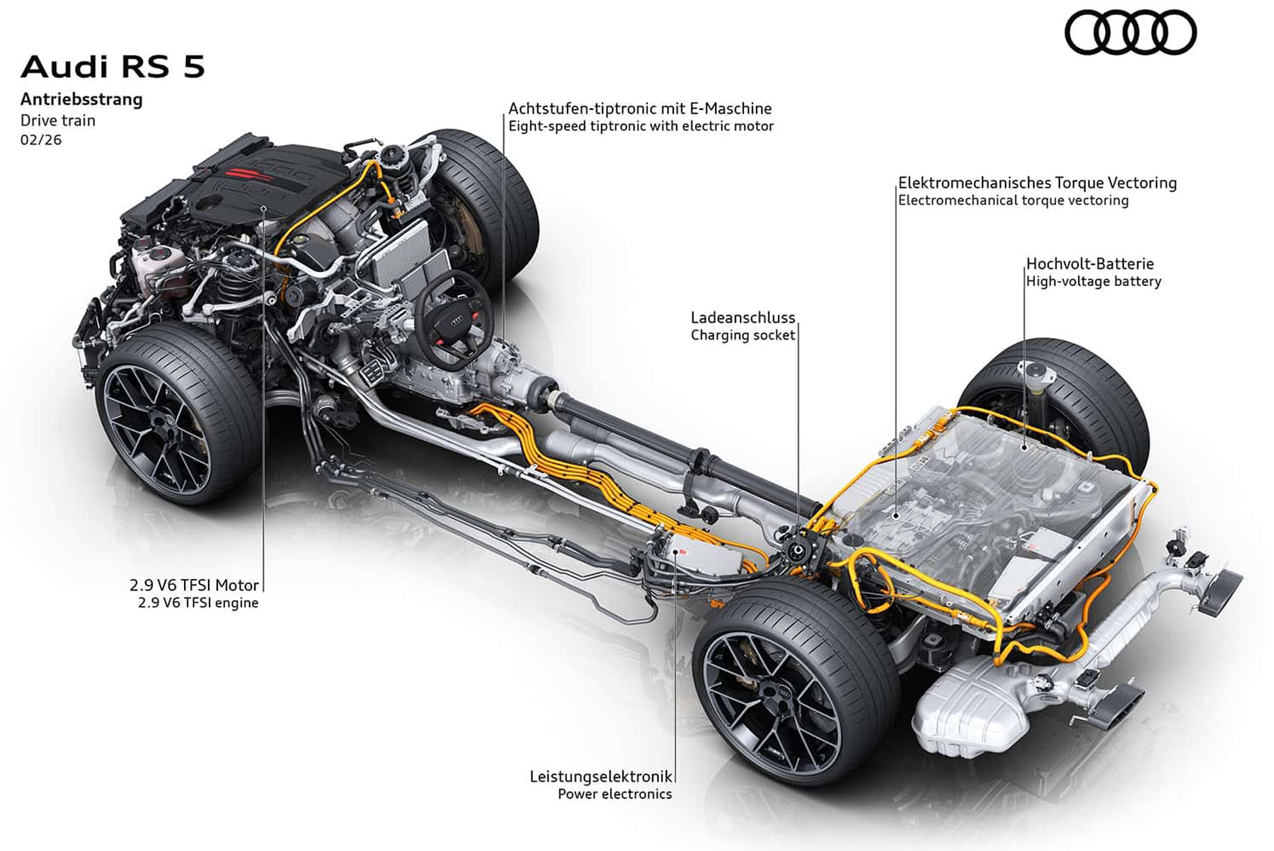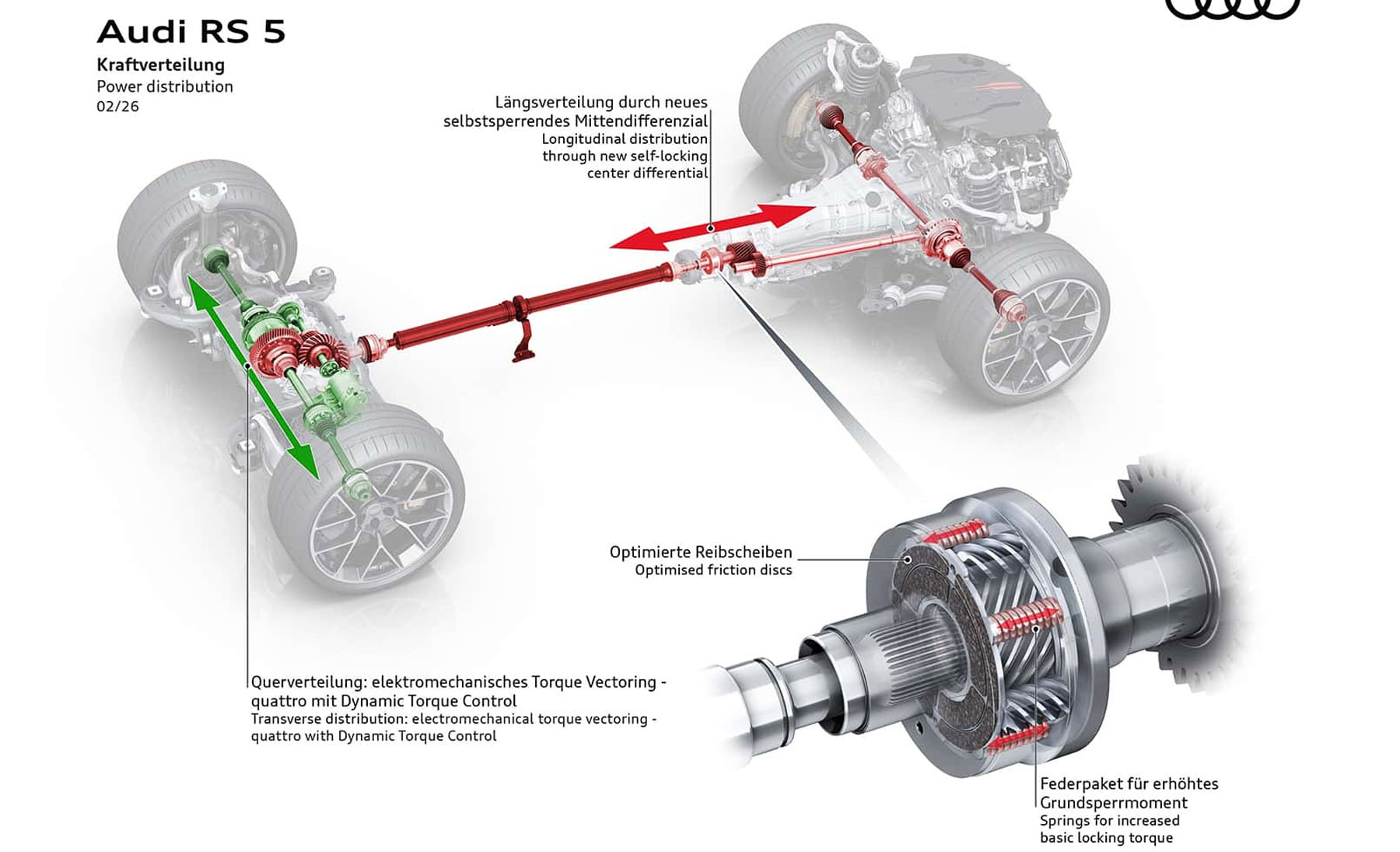 Το νέο quattro σύστημα φέρνει μια τεχνολογική καινοτομία παραγωγής: το Dynamic Torque Control με ηλεκτρομηχανική λειτουργία στον πίσω άξονα. Ένας επιπλέον ηλεκτροκινητήρας 8 kW σε συνδυασμό με μηχανικό γρανάζωμα επιτρέπει την κατανομή έως και 2.000 Nm μεταξύ των πίσω τροχών μέσα σε μόλις 15 msec.