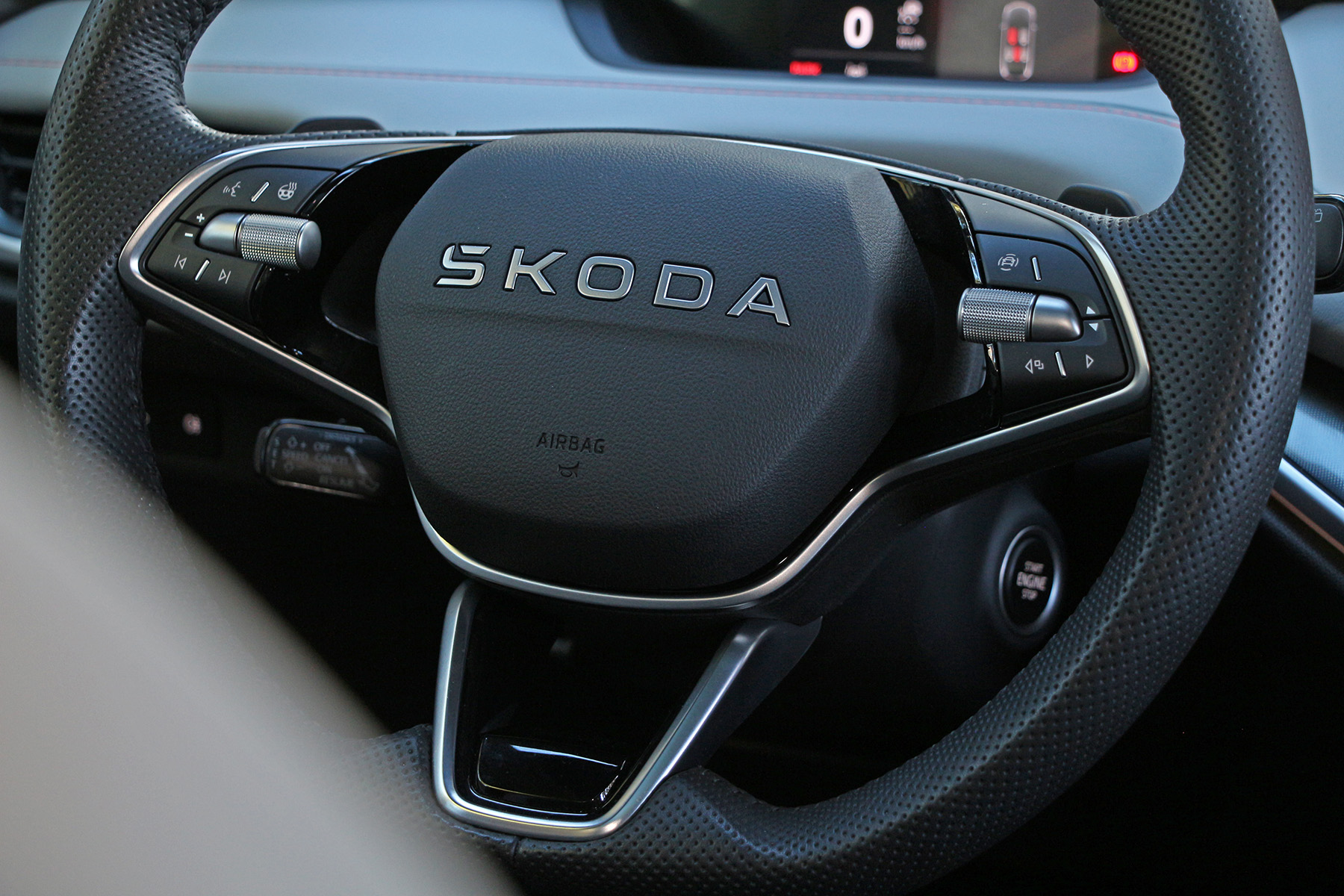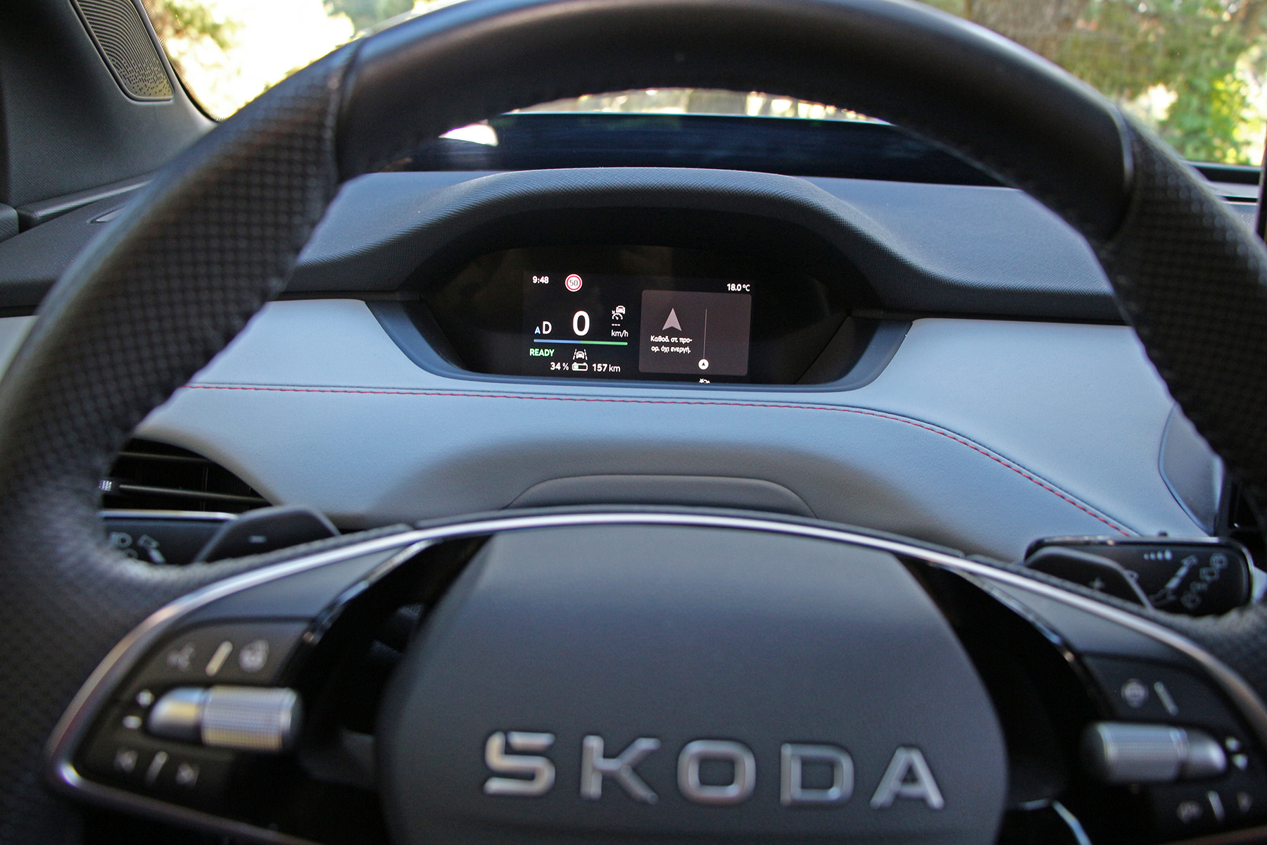 Μία μικρή διαφορά παρατηρείται στο τιμόνι, που πλέον φαντάζει πιο όμορφο με την προσθήκη μίας τρίτης ακτίνας για να συγκρατεί τη στεφάνη (συν το λεκτικό Skoda, αντί του λογοτύπου, στο κέντρο του).