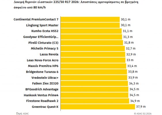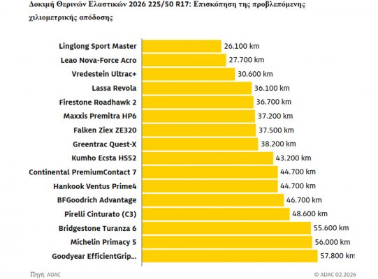 Ο γερμανικός οργανισμός ADAC δημοσίευσε τα αποτελέσματα της δοκιμής θερινών ελαστικών για το 2026, εξετάζοντας 19 μοντέλα στη δημοφιλή διάσταση 225/50 R17. Η συγκεκριμένη διάσταση αφορά κυρίως μεσαία και μικρομεσαία αυτοκίνητα με σπορ χαρακτήρα, γεγονός που καθιστά τα συμπεράσματα ιδιαίτερα σημαντικά για μεγάλο αριθμό οδηγών στην Ευρώπη.