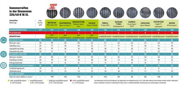 Ο γερμανικός οργανισμός ACE Auto Club Europa αξιολόγησε δέκα θερινά ελαστικά 225/40 R18, μια διάσταση που συναντάται σε μοντέλα όπως τα Volkswagen Golf 8, Audi A3, BMW Σειρά 1και Mercedes-Benz A-Class. Οι μετρήσεις πραγματοποιήθηκαν σε Ισπανία και Φινλανδία, με έμφαση στο φρενάρισμα, την υδρολίσθηση, την οδική συμπεριφορά και την αντίσταση κύλισης.