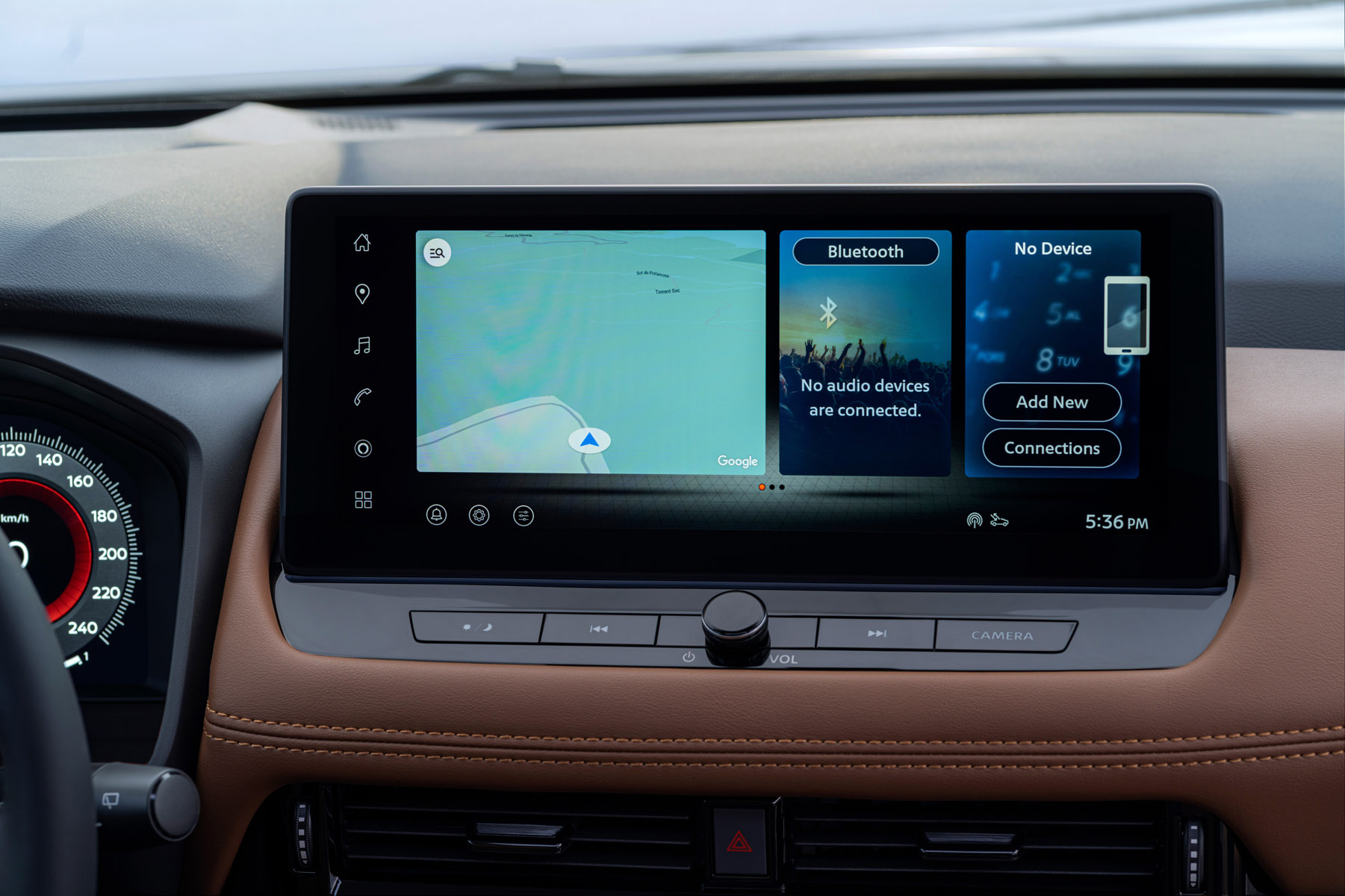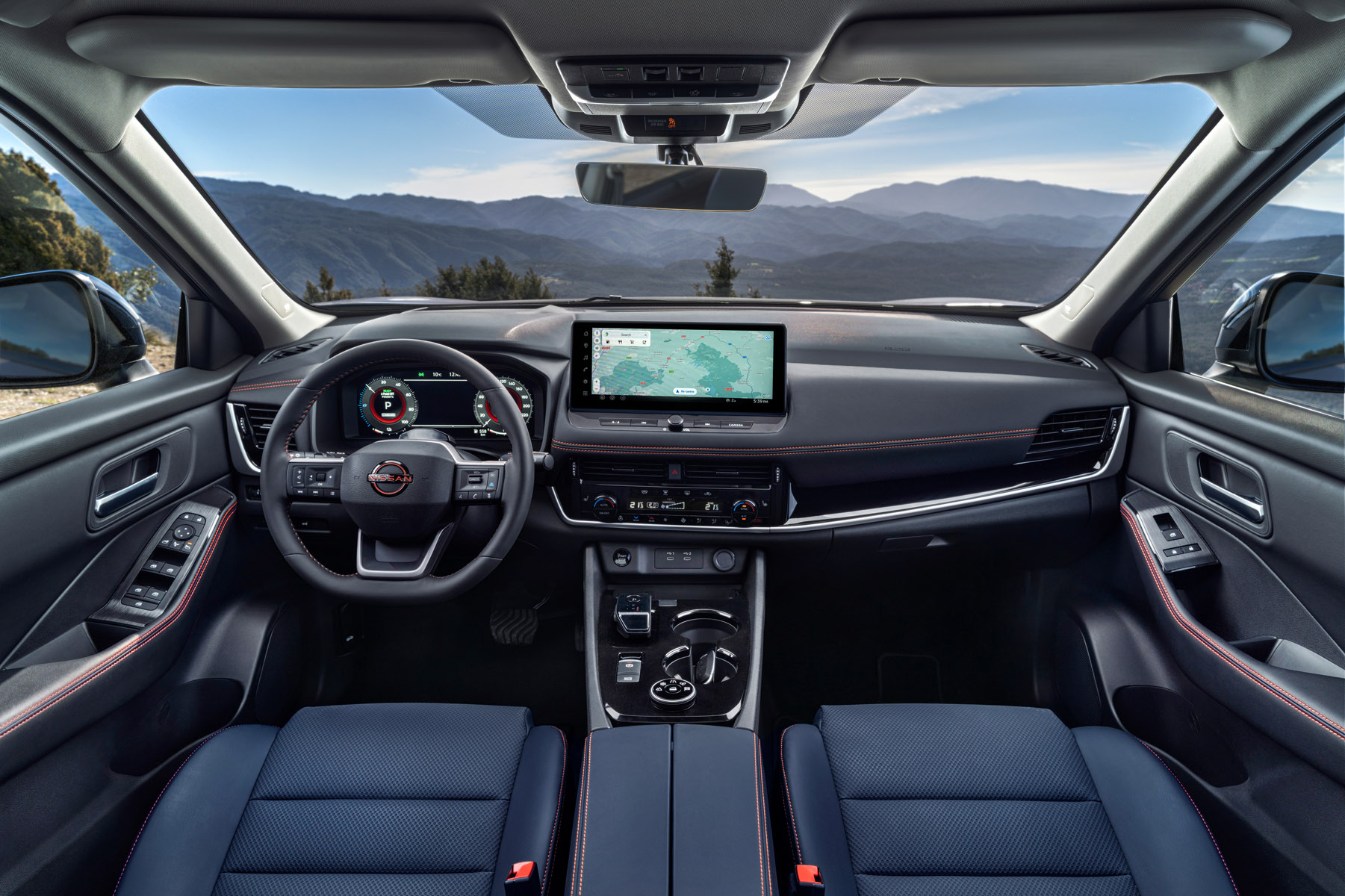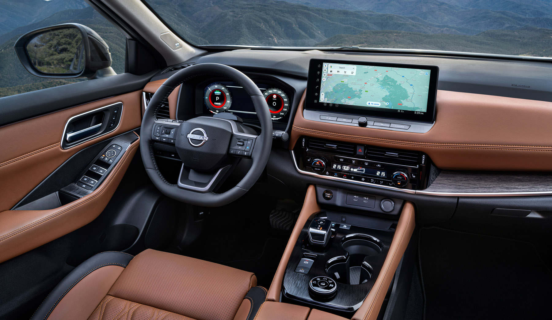 Στο εσωτερικό, η Nissan δίνει έμφαση στην ποιότητα και την καθημερινή άνεση. Νέα υλικά επένδυσης, όπως καφέ δερμάτινη ταπετσαρία με καπιτονέ μοτίβο και διακοσμητικά με υφή ξύλου, αναβαθμίζουν την αίσθηση της καμπίνας.