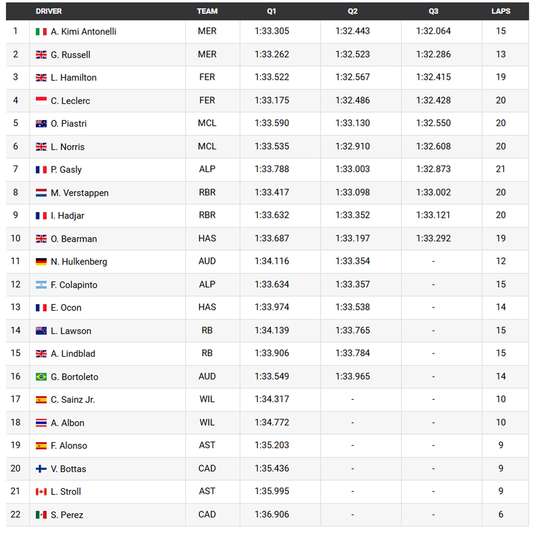 Αυτό άνοιξε τον δρόμο για τον Antonelli, ο οποίος εκμεταλλεύτηκε την ευκαιρία στο Q3. Στην πρώτη του προσπάθεια σημείωσε χρόνο 1:32.322, ενώ στη συνέχεια βελτίωσε την επίδοσή του στο 1:32.064, θέτοντας έναν πολύ δύσκολο στόχο για τους αντιπάλους του.