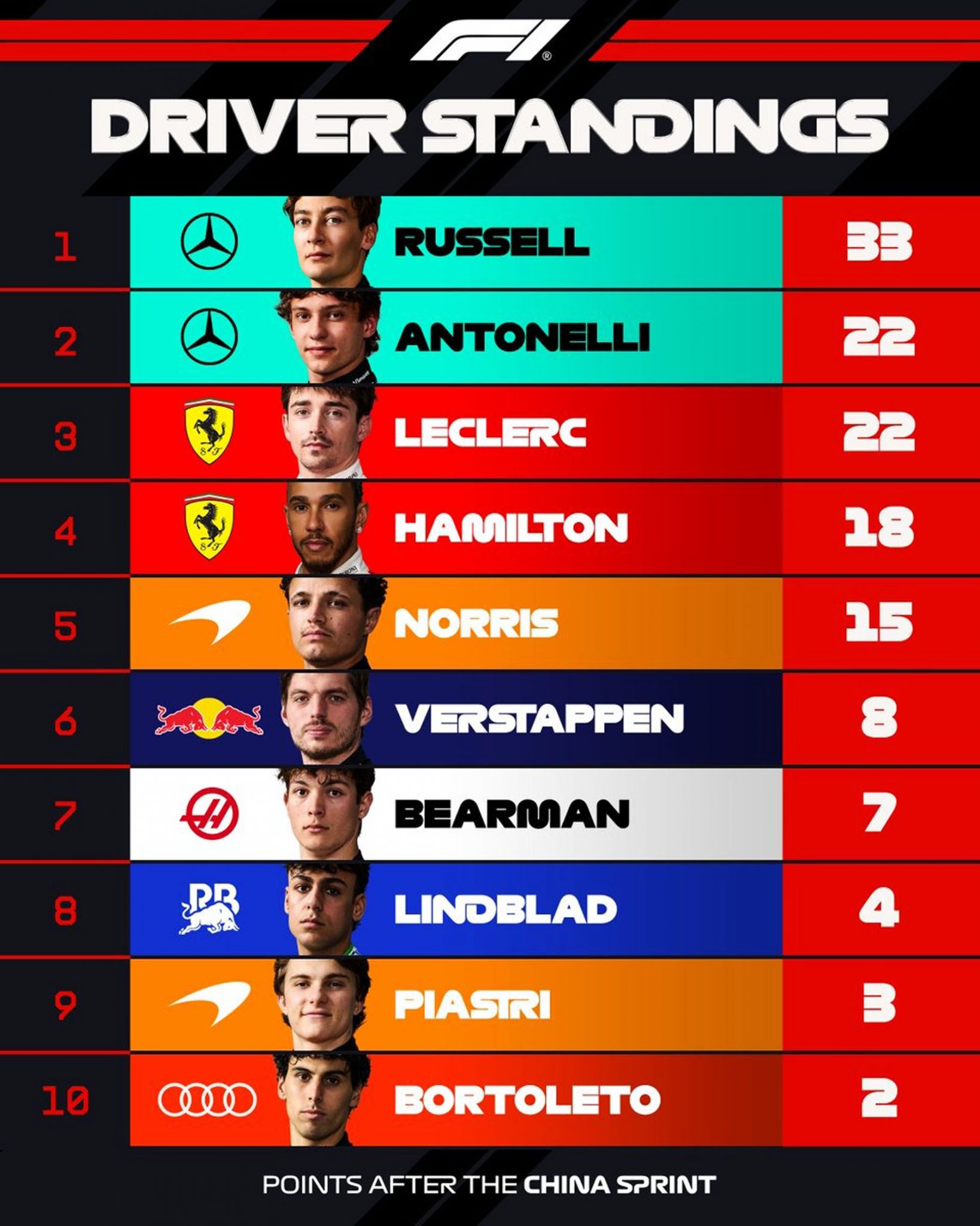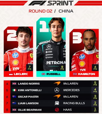 Ο George Russell πήρε τη νίκη στο Sprint στη Σανγκάη έπειτα από έντονη μονομαχία με τους Lewis Hamilton και Charles Leclerc, σε έναν αγώνα όπου η Ferrari έδειξε σαφώς πιο ανταγωνιστική σε σχέση με τις κατατακτήριες. Μετά το Sprint, ακολουθούν οι κατατακτήριες για τον αυριανό αγώνα στις 09:00.