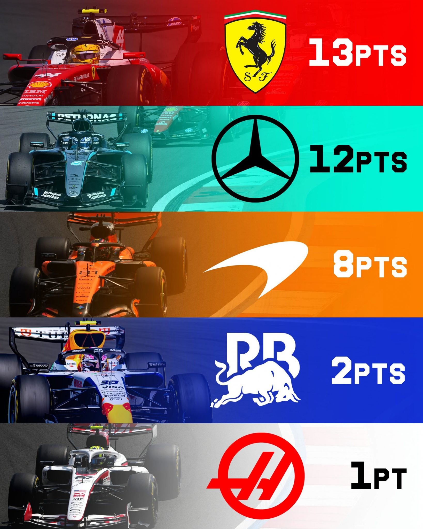 Πιο πίσω, ο Liam Lawson και ο Oliver Bearman επέλεξαν να μην μπουν στα pits και εκμεταλλεύτηκαν τη στρατηγική για να μπουν στη ζώνη βαθμών. Ο Max Verstappen, αντίθετα, είχε πολύ κακή εκκίνηση και βρέθηκε στο τέλος της κατάταξης, καταφέρνοντας να ανακάμψει μέχρι την ένατη θέση αλλά χωρίς να πάρει βαθμούς.