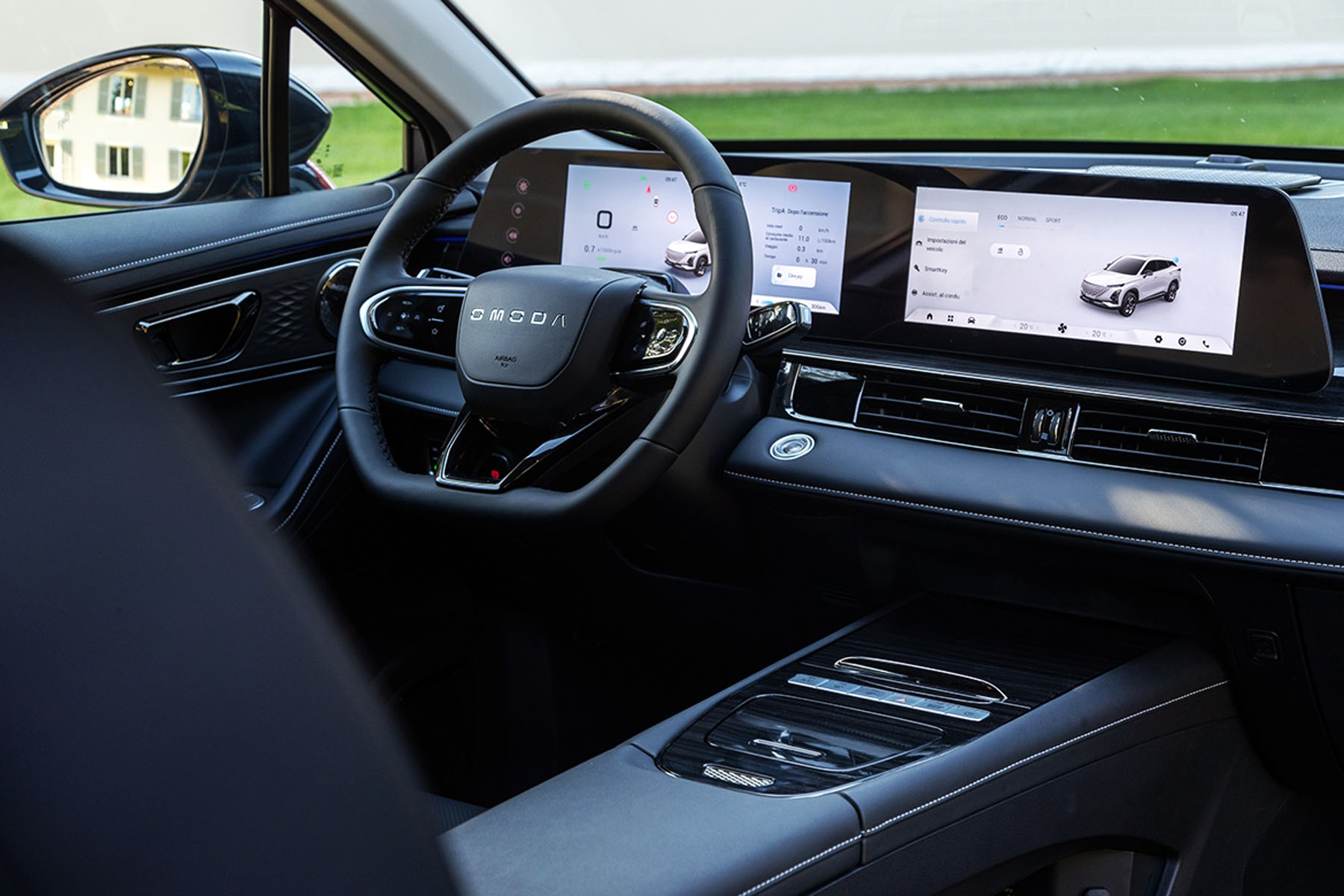 Στο εσωτερικό, το Omoda 5 SHS-H δίνει ιδιαίτερη έμφαση στην ψηφιακή τεχνολογία. Το ταμπλό κυριαρχείται από μια ενιαία κυρτή διάταξη δύο οθονών 10,25 ιντσών, μία για τον ψηφιακό πίνακα οργάνων και μία για το σύστημα πολυμέσων. Η διάταξη αυτή δημιουργεί ένα σύγχρονο περιβάλλον οδήγησης, ενώ η εργονομία παραμένει αρκετά προσεγμένη.